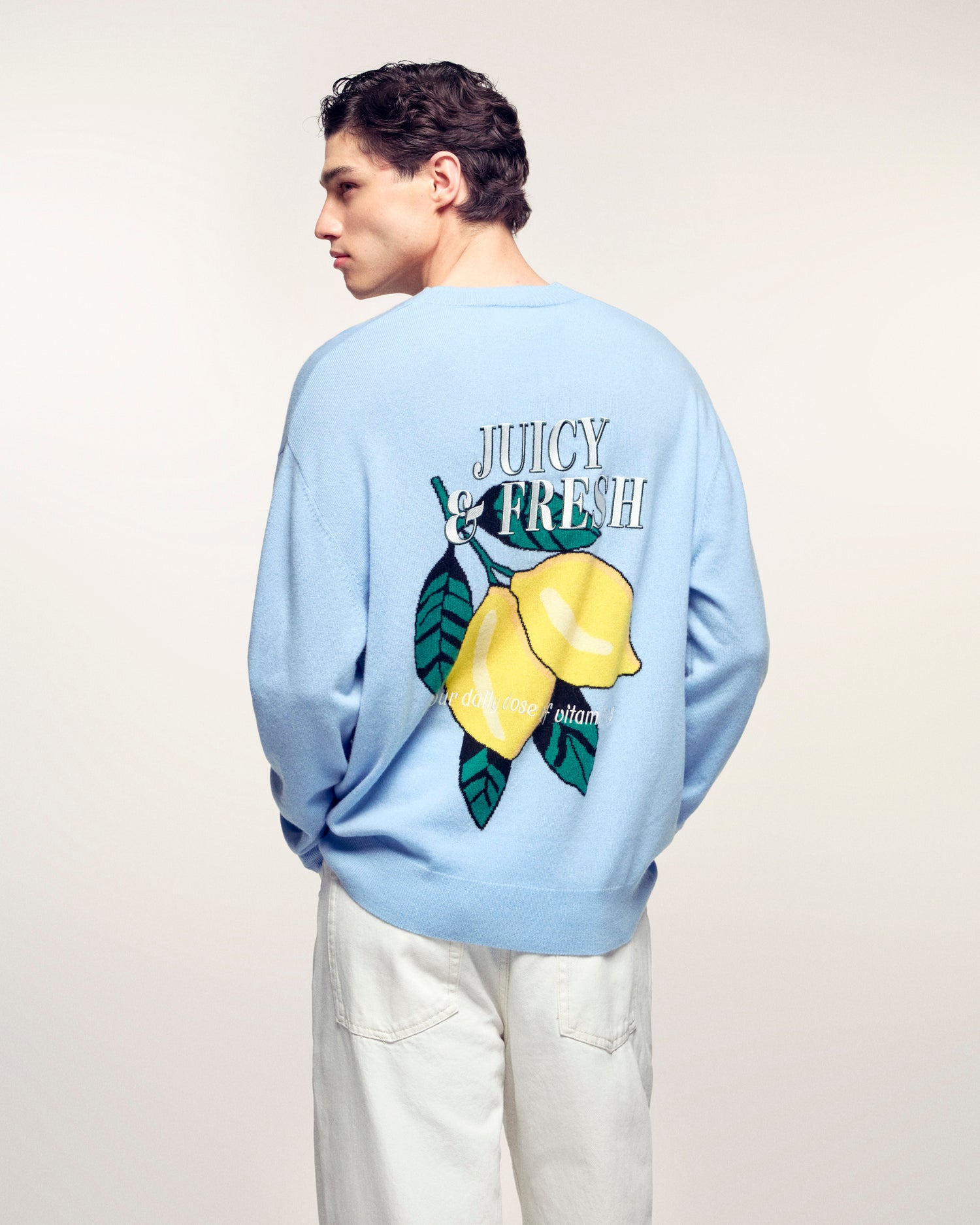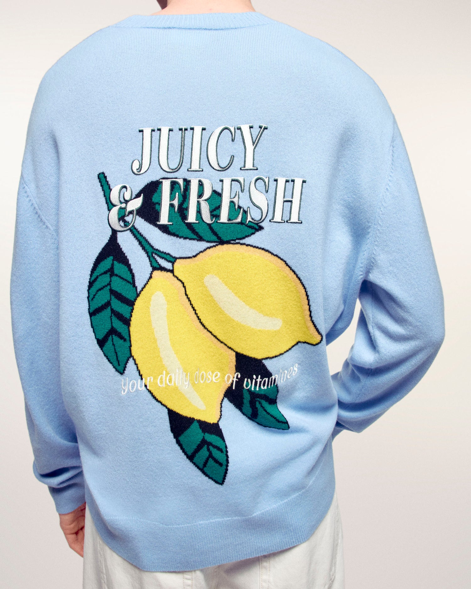 La tua dose quotidiana di buon umore. Realizzato in Cashmere 2 fili, questo maglione offre un comfort eccezionale. La sua vestibilità regular intramontabile è vivacizzata da un grande motivo a intarsio sul retro, che rappresenta limoni con il messaggio "Juicy & Fresh your daily dose of vitamine".