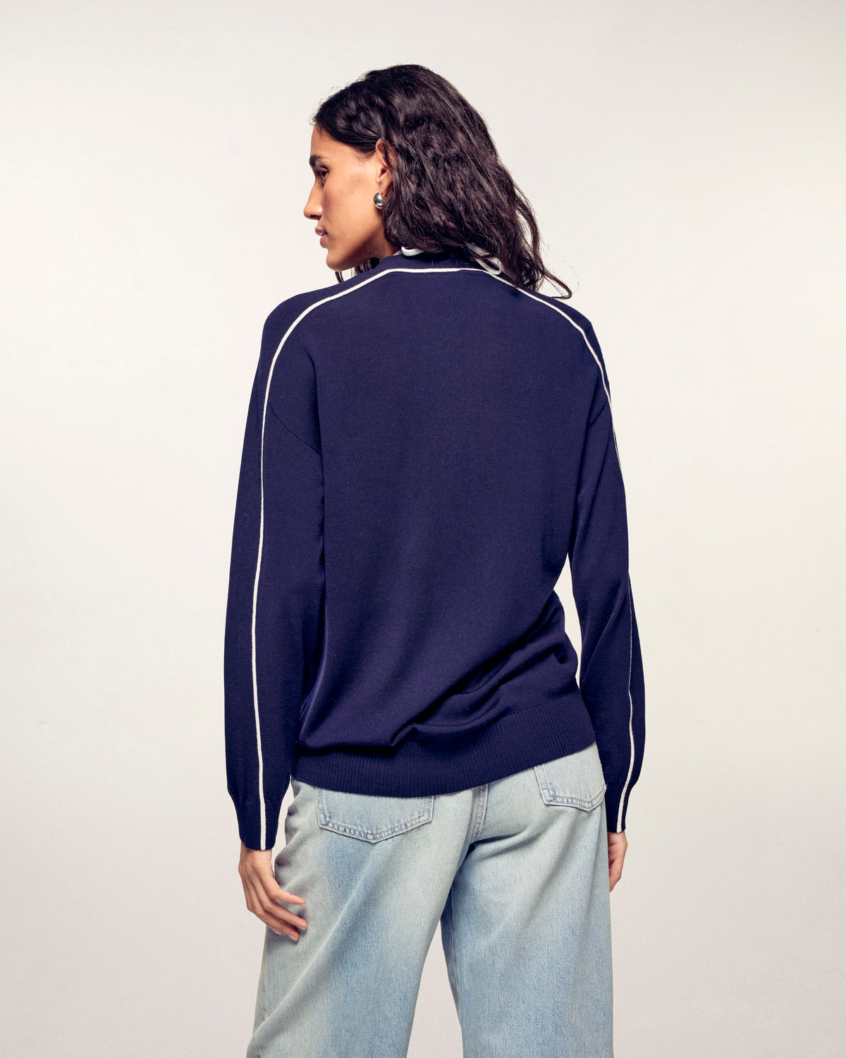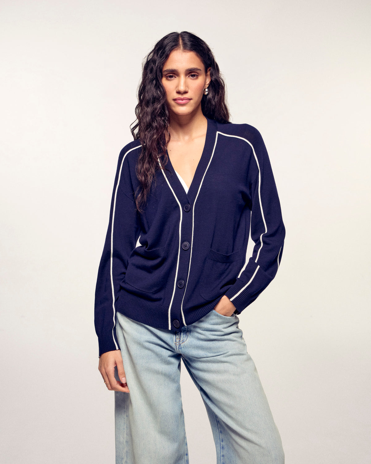 Un look chic e strutturato per questo maglione cardigan realizzato in lana merino. Si distingue per i suoi bordini a contrasto che sottolineano lo scollo e l'abbottonatura, offrendo una silhouette moderna ed elegante per la stagione.