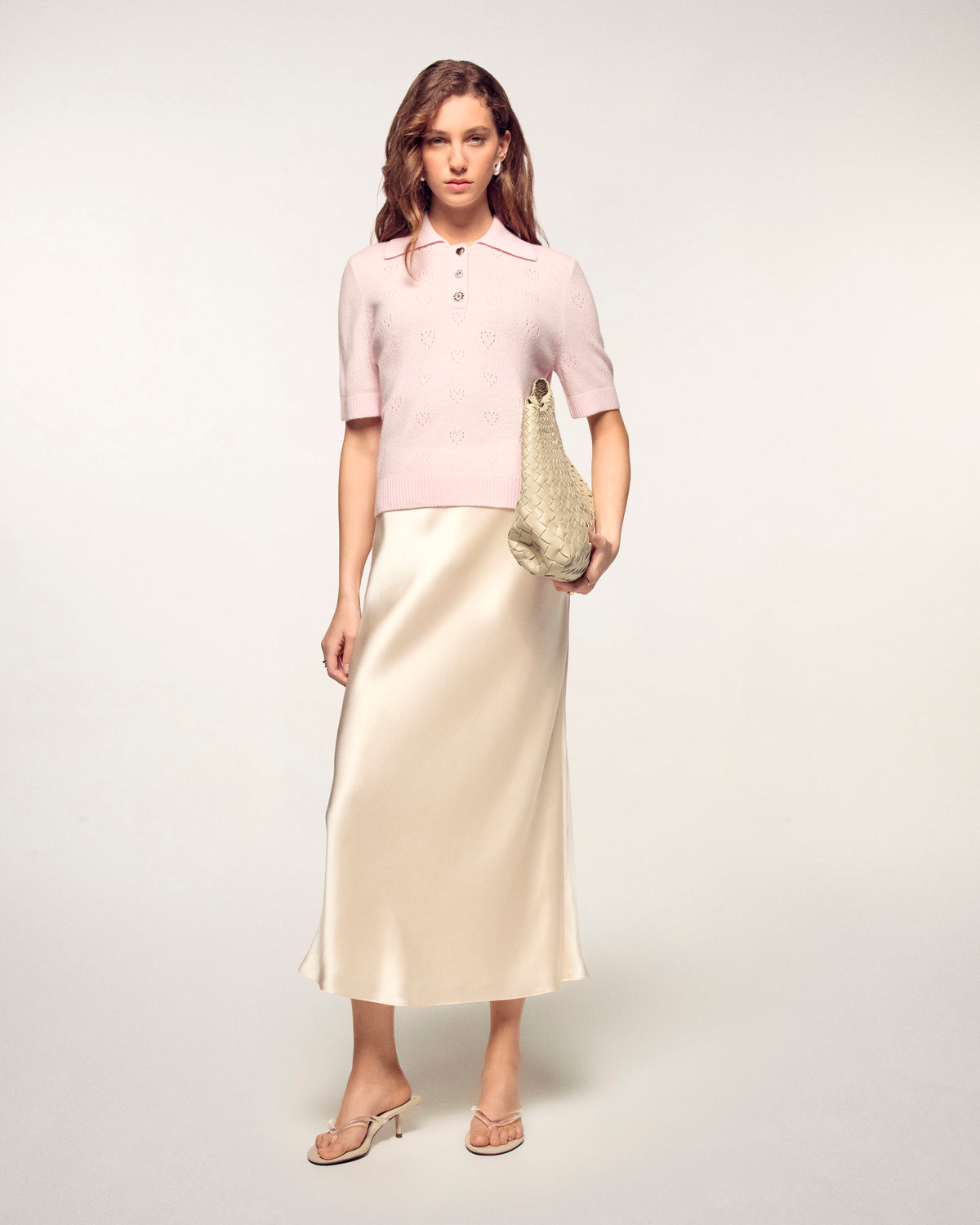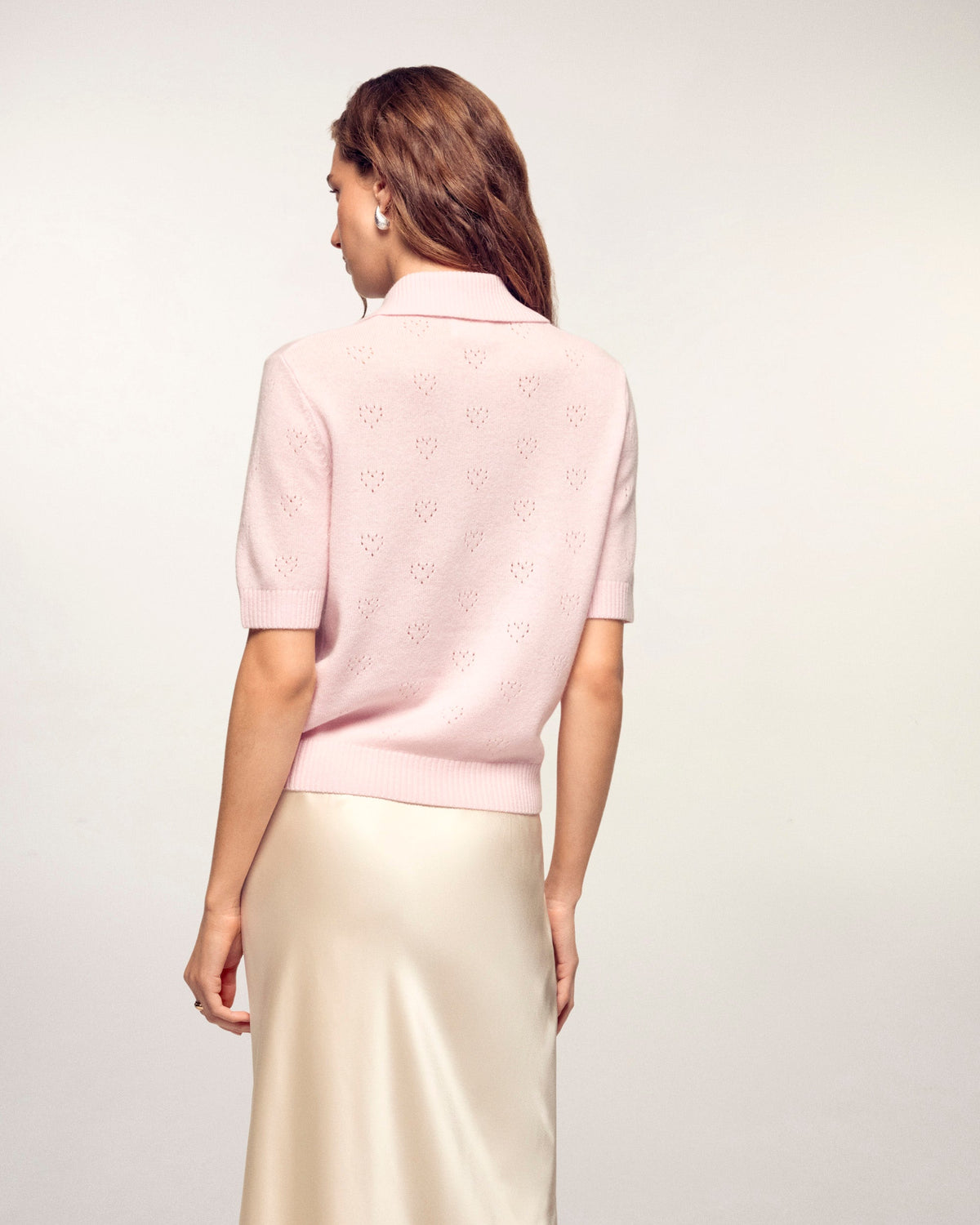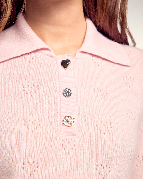 Una silhouette delicata e romantica per questo maglione corto in cashmere dall'elegante colletto a polo. Si distingue per il suo punto traforato a forma di cuore e i suoi bottoni fantasia spaiati che donano un tocco prezioso e femminile a questo basic rivisitato.