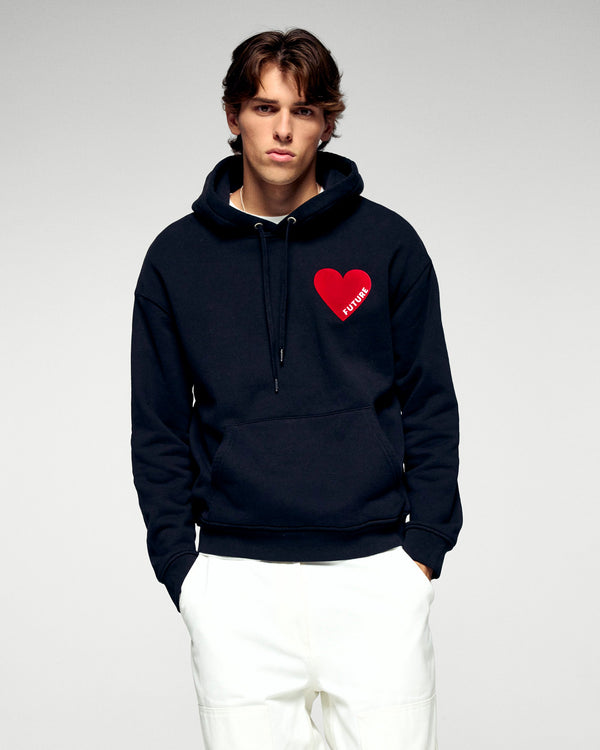 Con un cappuccio con cordoncini, una tasca davanti e maniche lunghe, questa felpa in cotone presenta un cuore floccato FUTURE sul petto.