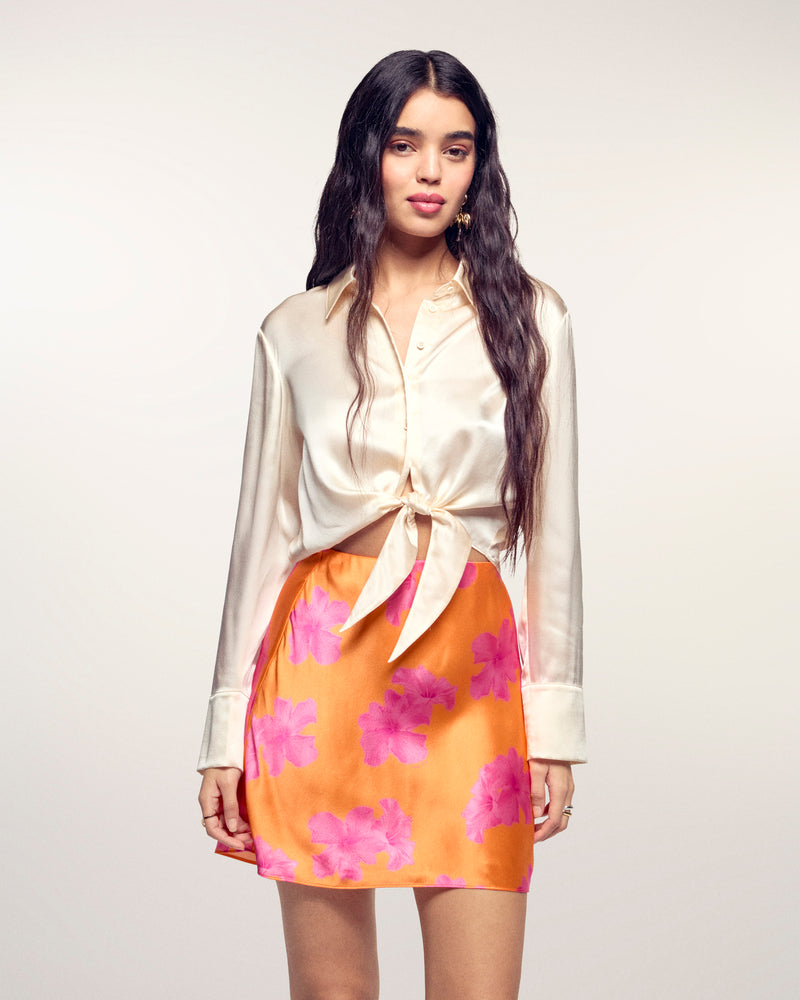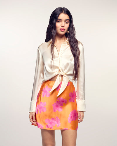 Materiale setoso e colore vibrante: questa camicia corta apporta un tocco di freschezza alla tua silhouette di stagione. Dotata di una chiusura con bottoni e maniche lunghe, si annoda sul davanti. Completa il tuo look con una gonna fluida.