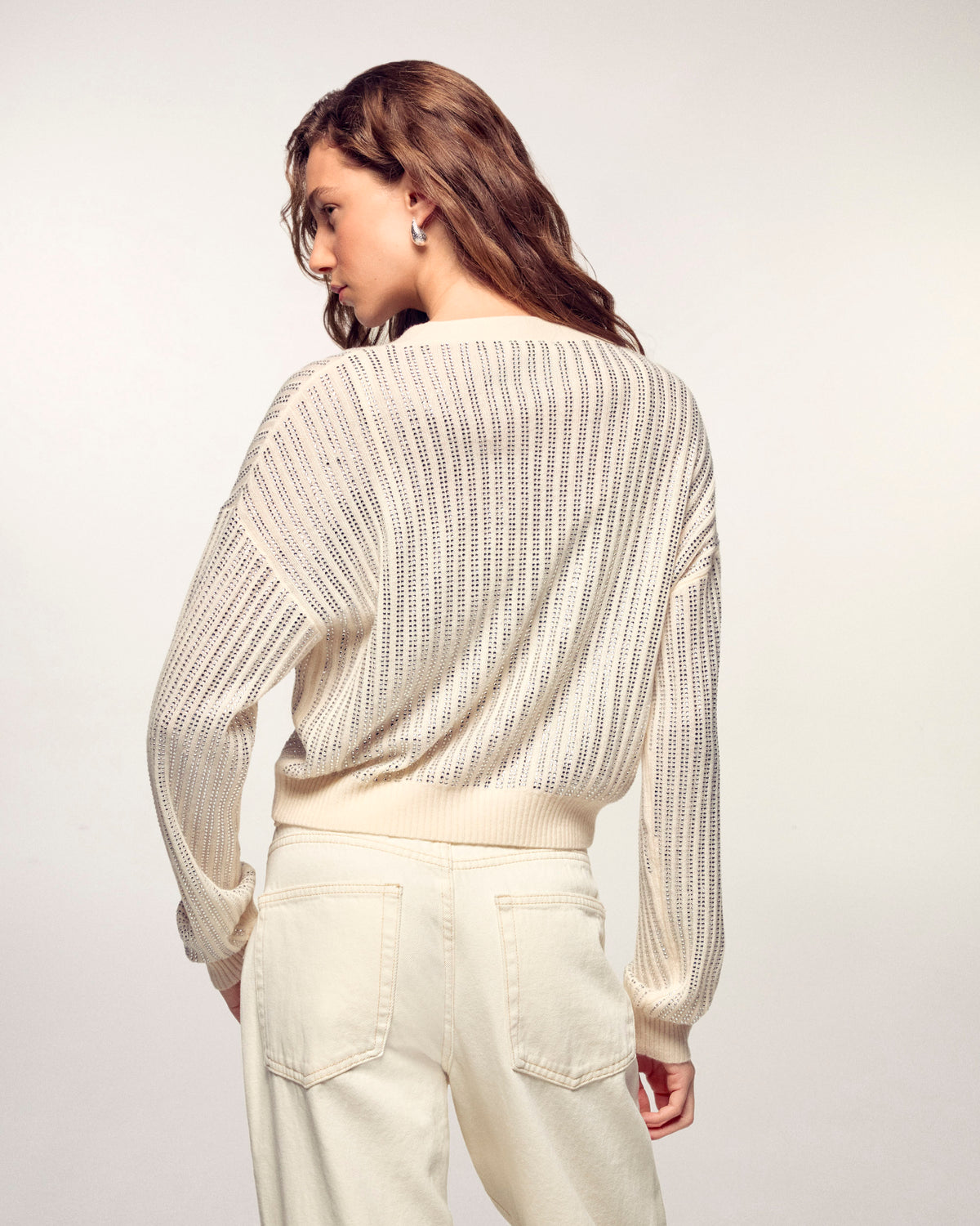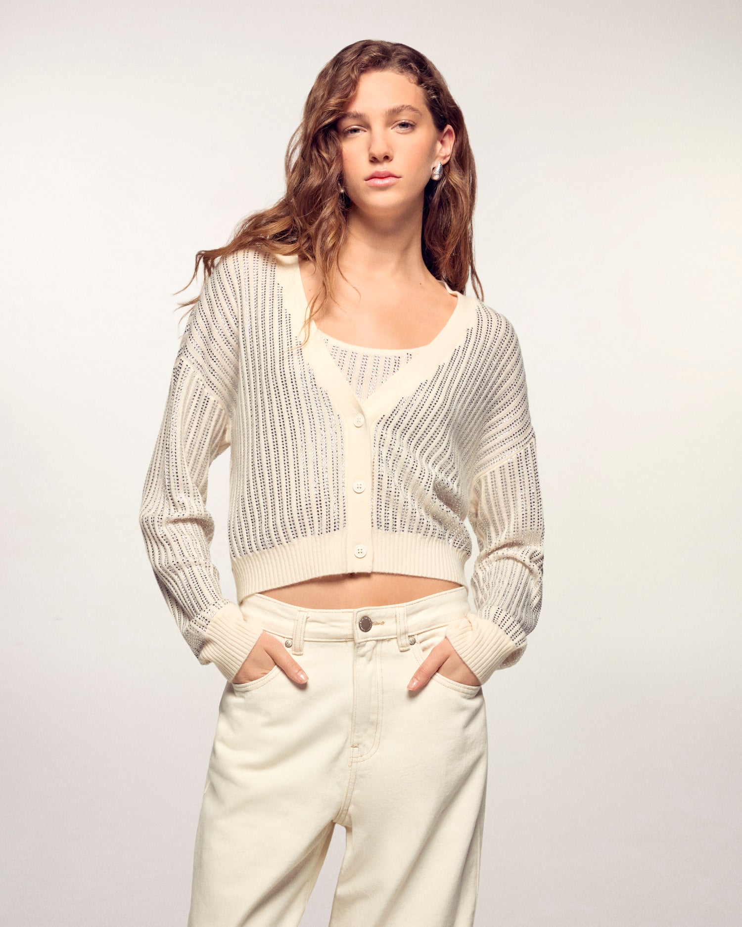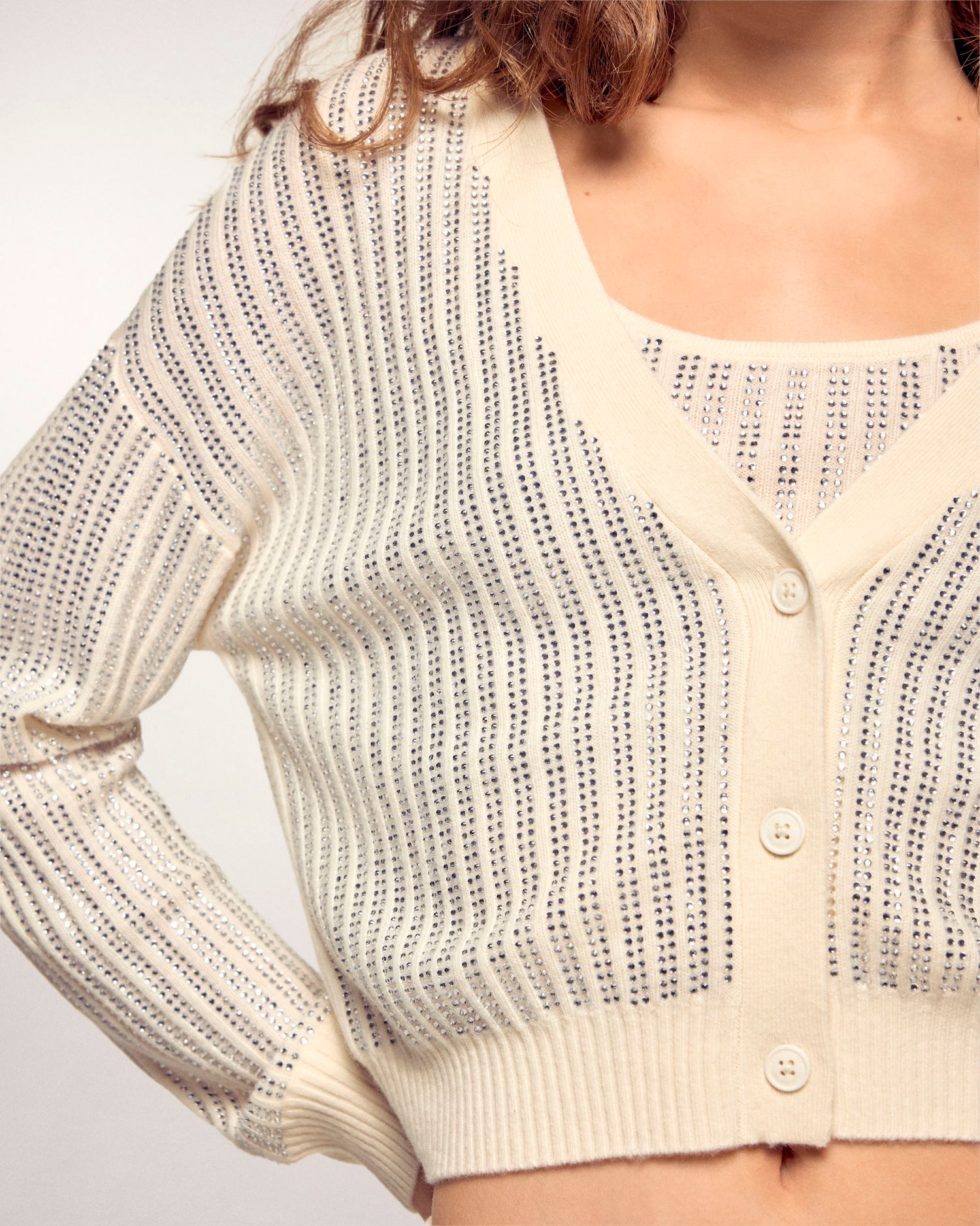 Un capo prezioso e scintillante che illumina il vostro guardaroba di stagione. Questo maglione cardigan si distingue per il suo gioco di strass argentati "hotfix" delicatamente disposti, offrendo un look chic e sofisticato per una silhouette decisamente moderna.