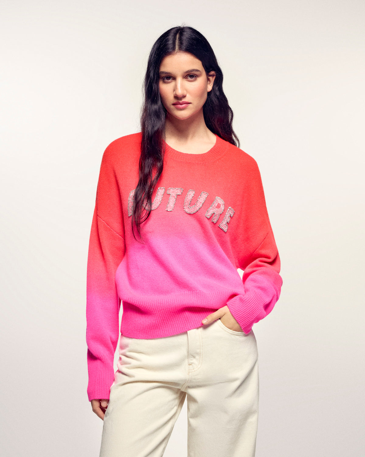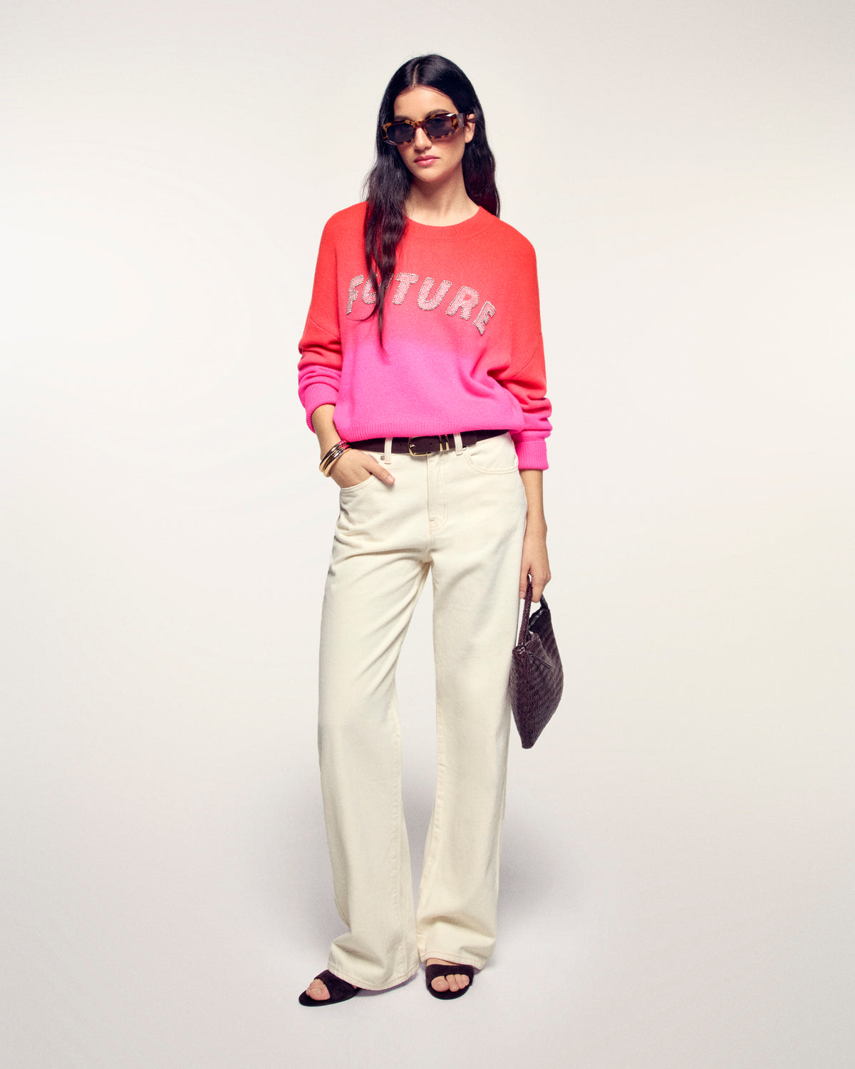 Il maglione audace dal design futuristico. Realizzato in Cashmere 4 fili, questo maglione offre una maglia morbida e una vestibilità confortevole. Il suo taglio regular è reso particolare da una grande patch ricamata con la scritta "FUTURE" in perle, che aggiunge un tocco scintillante e ultra-moderno.