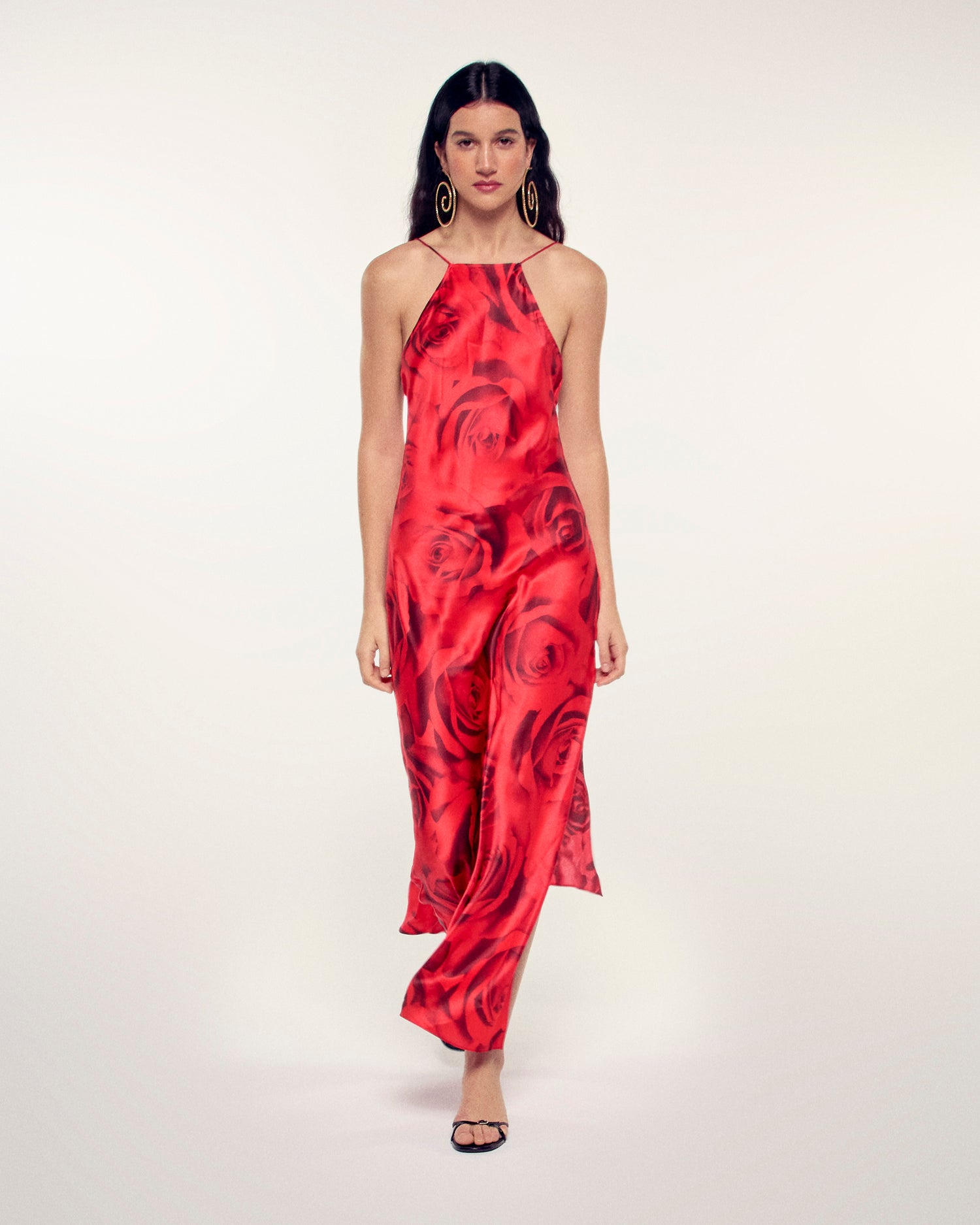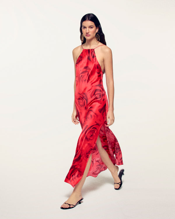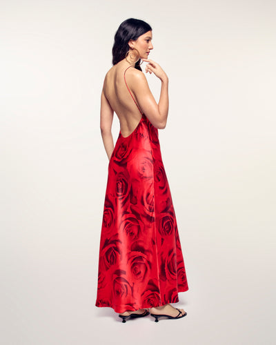 Realizzato in 100% Seta per una vestibilità fluida e lussuosa, questo capo è sublimato dalla scenografica schiena scoperta e dall'audace stampa a rose. Un taglio slim lungo che garantisce un look sofisticato.