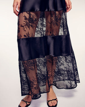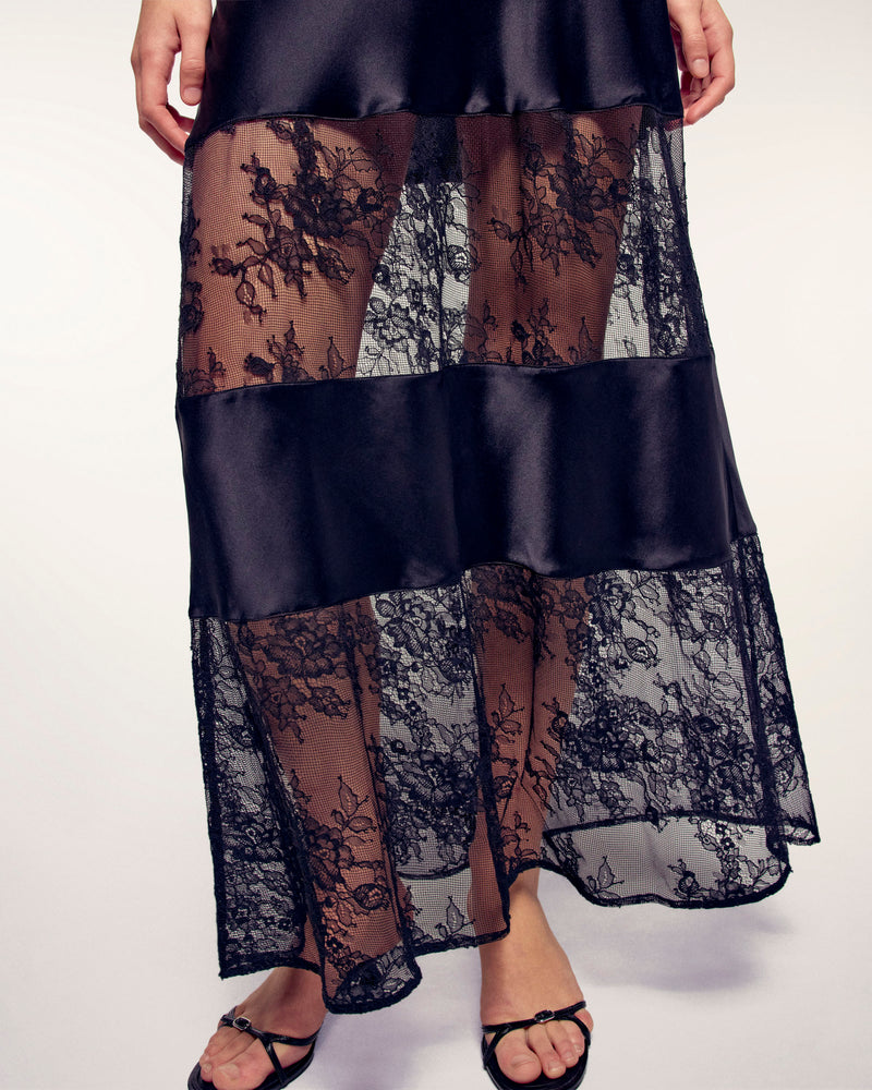 Realizzato in 100% Seta per una vestibilità fluida, questo capo presenta un taglio lungo e slim. Il suo design è audacemente strutturato da ampi galloni in pizzo, che donano consistenza e sofisticatezza.