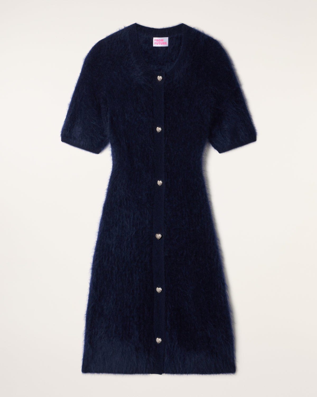 A Abito lavorato a maglia dal fascino retrò, con il suo volume strutturato, i suoi dettagli testurizzati e la sua fila di bottoni a cuore argentati che gli conferiscono un tocco molto femminile.