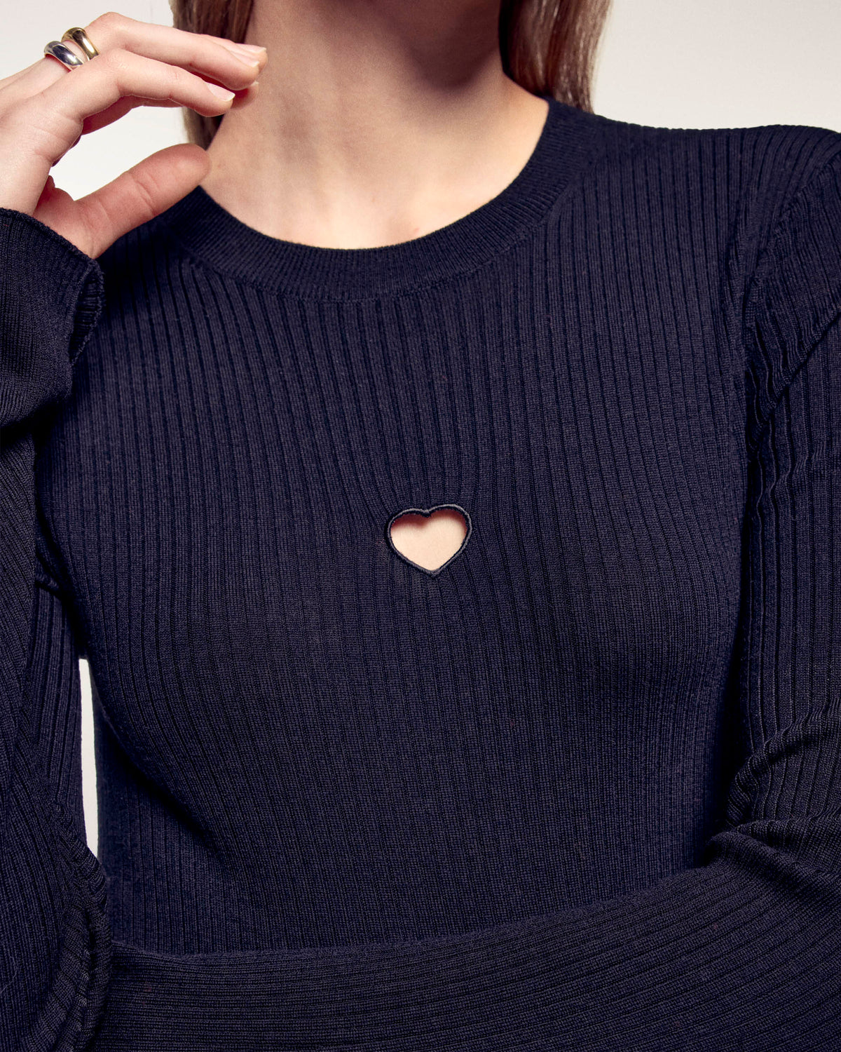 Questo top aderente presenta un cuore traforato, per riscaldare il tuo look con eleganza. Realizzato in lana merino 2 fili, è munito di uno scollo tondo e di maniche lunghe. Indossalo con un paio di pantaloni larghi per uno stile sofisticato!