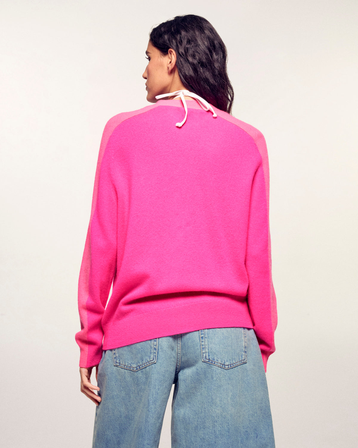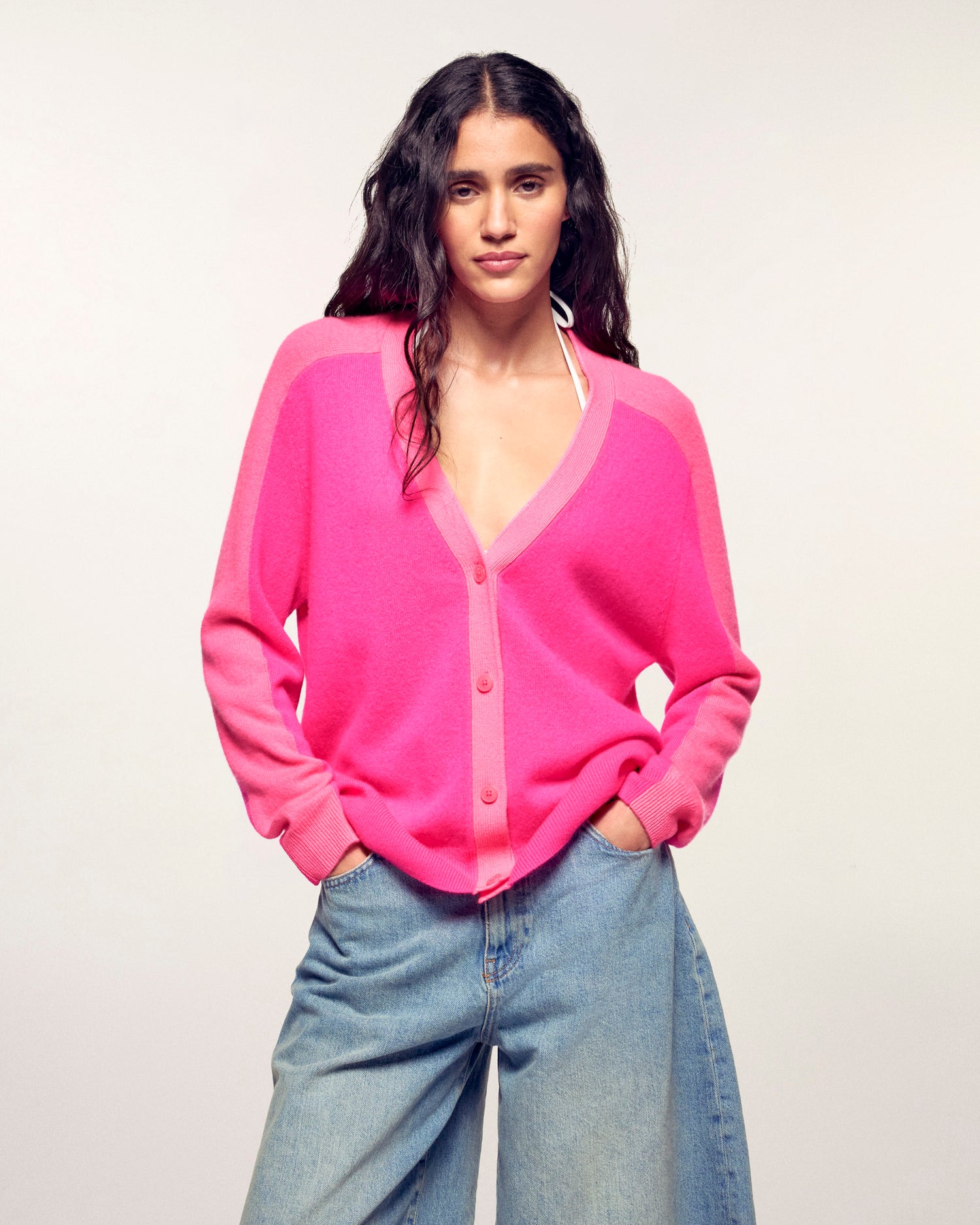 Un capo al tempo stesso morbido e grafico che dona un tocco di brio al vostro guardaroba di stagione. Questo cardigan in leggero cashmere si distingue per il suo gioco di contrasti sull'abbottonatura e sulle maniche, offrendo una silhouette moderna e luminosa.