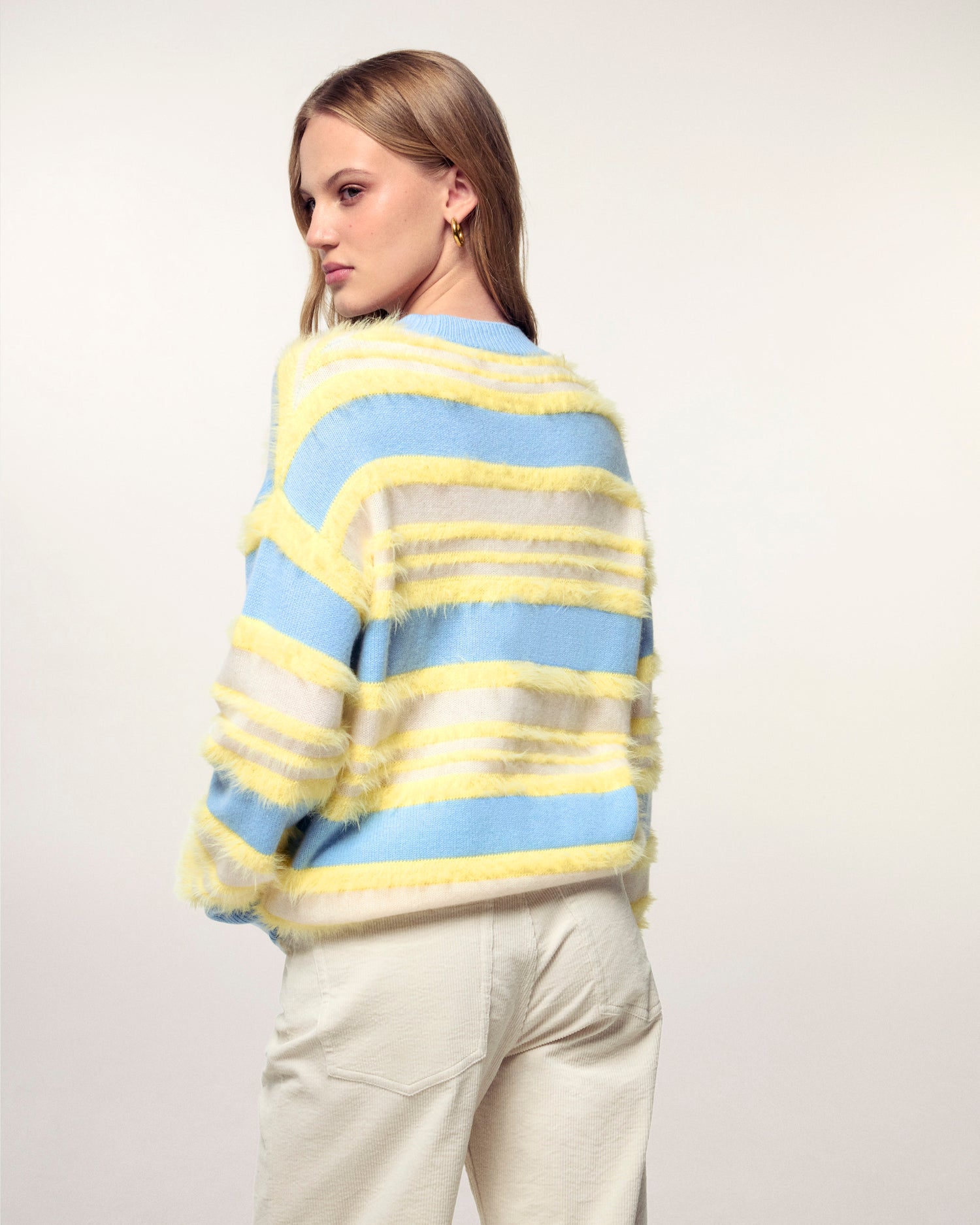 A Maglione in maglia a righe vibranti, che mescola colori intensi, texture e un volume avvolgente per un look pieno di energia.