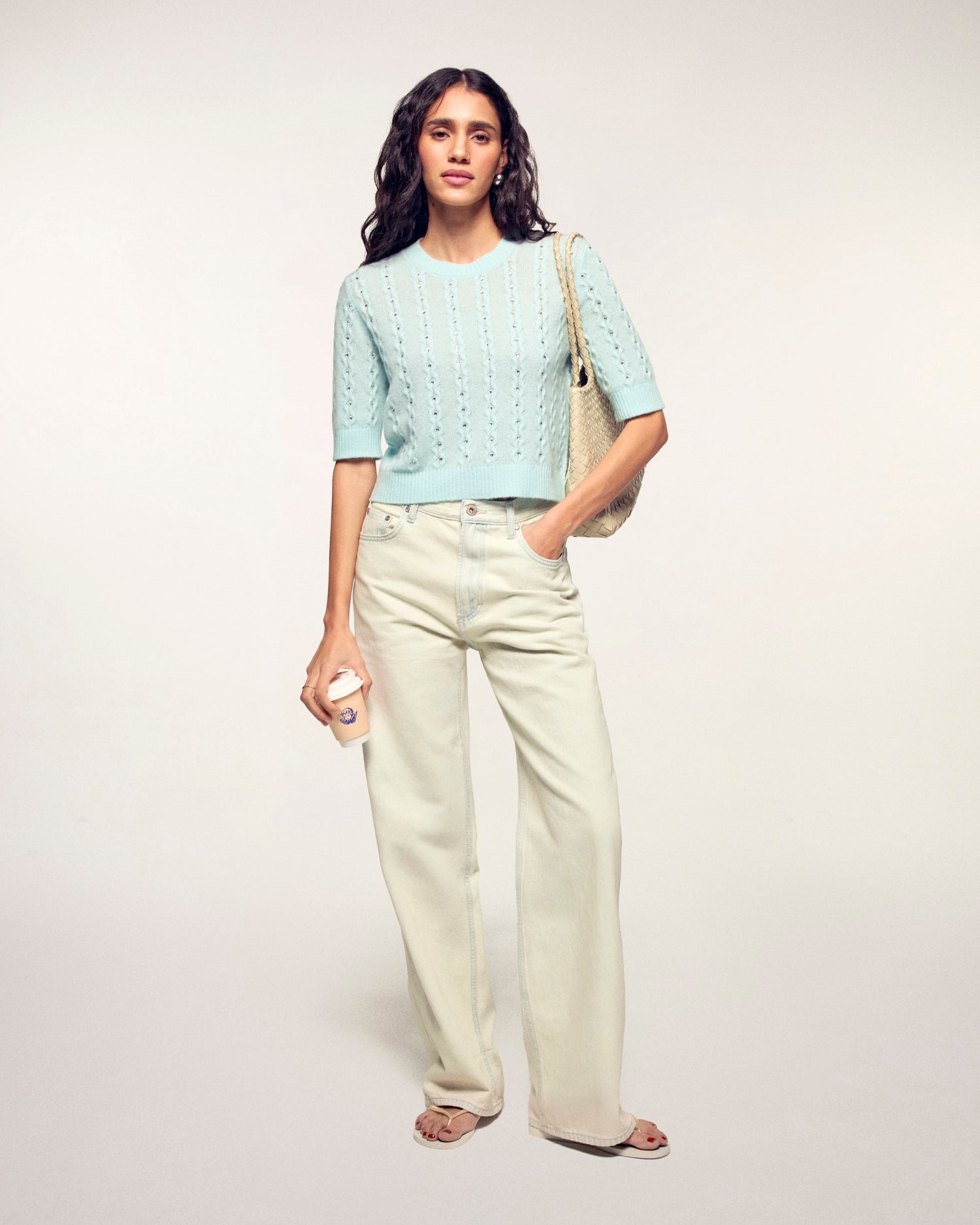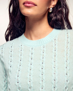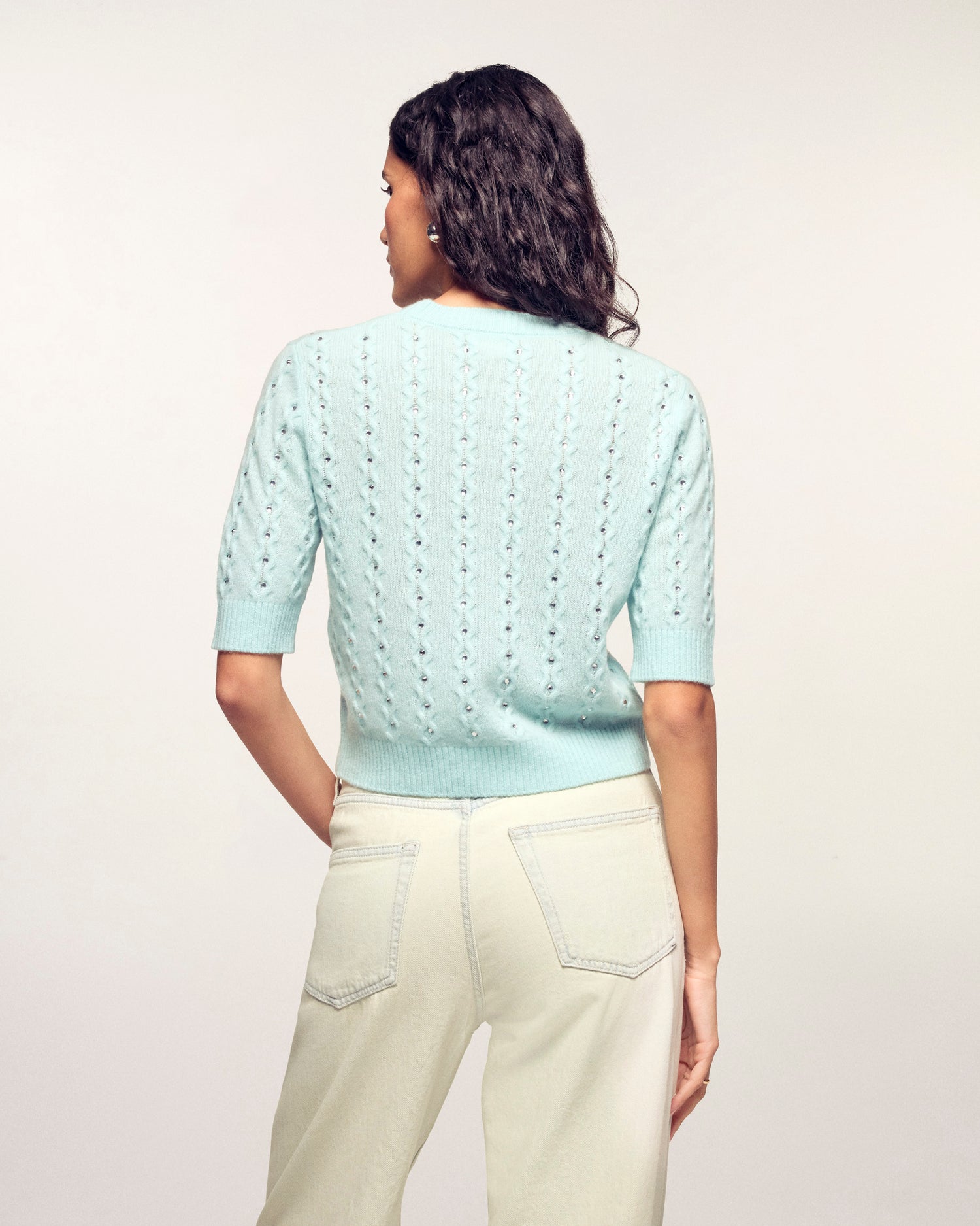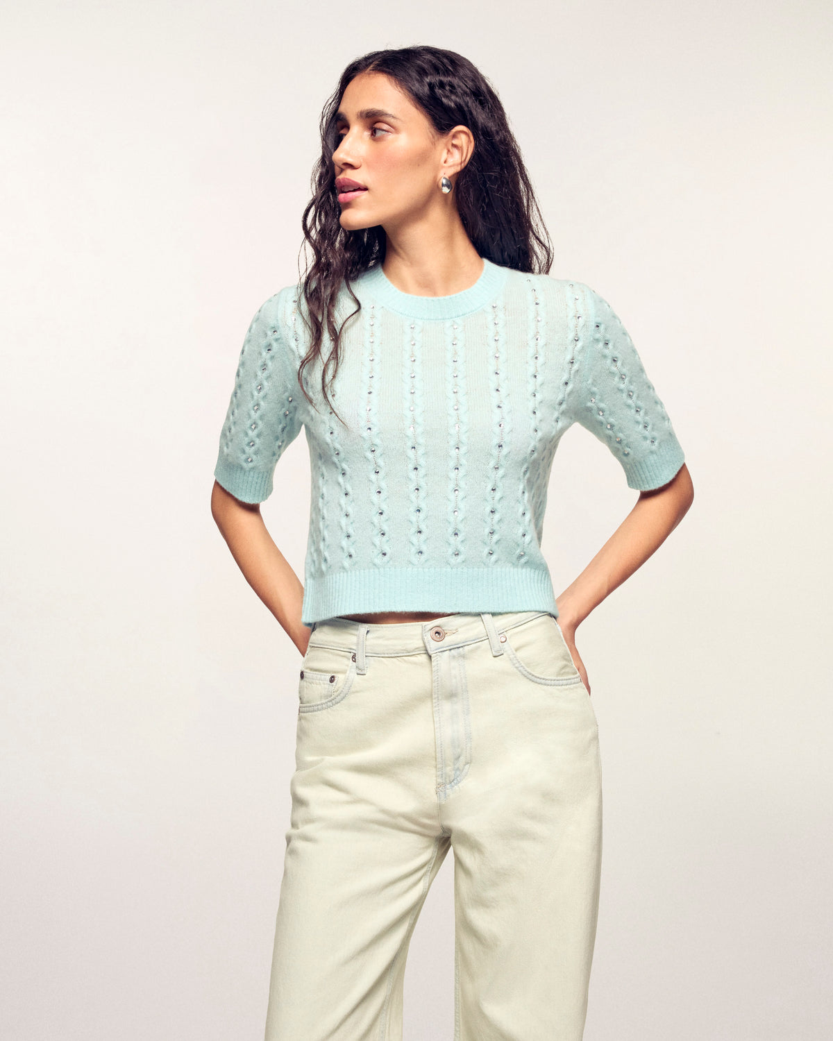 Un capo prezioso e luminoso che rivisita i classici con un tocco di brillantezza. Questo top in leggero cashmere si distingue per la lavorazione a trecce delicate su tutto il corpo, impreziosita da strass integrati per un'allure festiva e sofisticata.