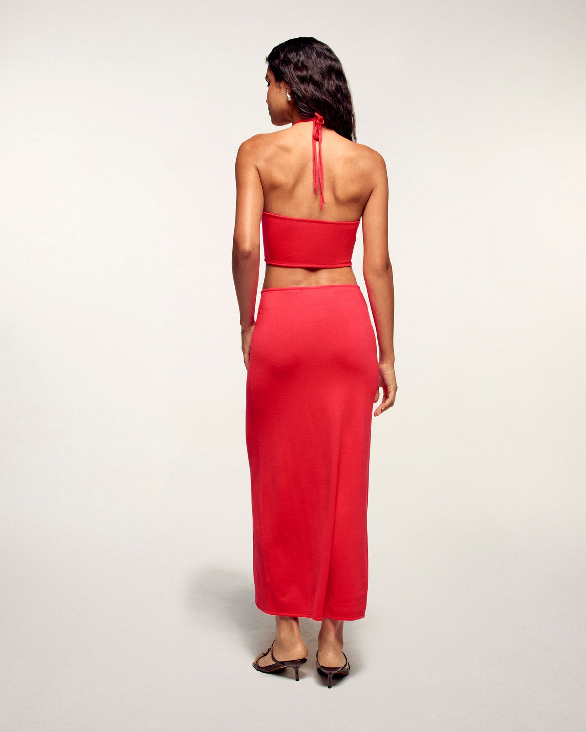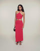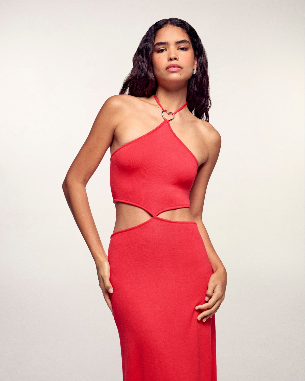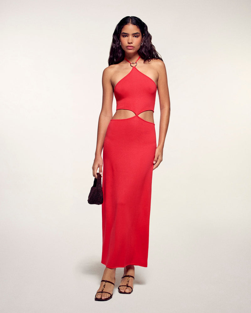 Audace e romantico, questo abito lungo in maglia si impone come l'indispensabile del tuo guardaroba estivo. Realizzato in pura lana merino extrafine, si distingue per i dettagli delle fibbie gioiello in metallo argentato a forma di cuore, che rivelano moderni ritagli traforati in vita. Una silhouette solare al contempo libera e sofisticata, ideale per un'eleganza senza sforzo durante le belle giornate.