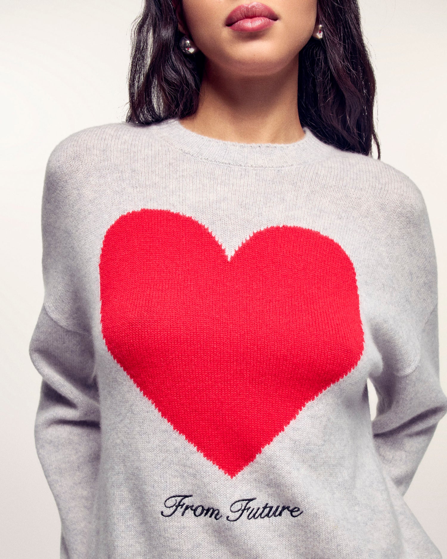 Realizzato in Cashmere 4 fili, questo maglione offre una maglia densa e morbida. Il suo taglio regular intramontabile è reso dinamico da un grande motivo a cuore realizzato in intarsio, con la scritta "Future" ricamata al centro.