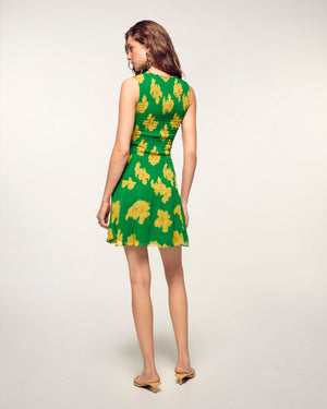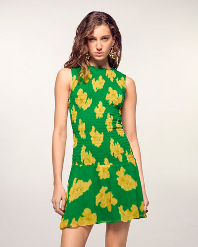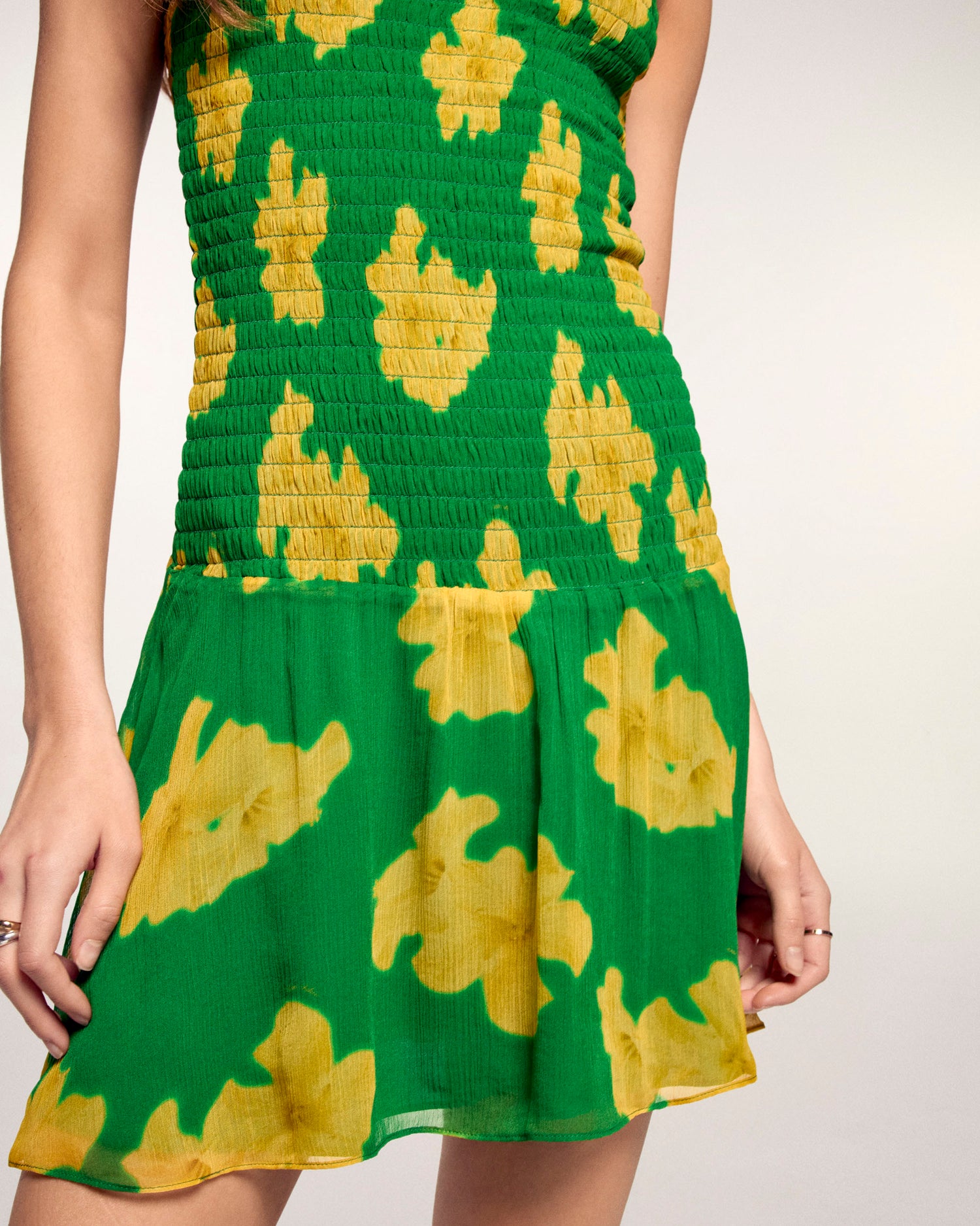 Un must-have della nostra collezione estiva ispirata al Brasile, questo abito corto senza maniche è realizzato in una viscosa fluida. Si distingue per la parte superiore interamente a punto smock che sottolinea la silhouette prima di svasarsi leggermente sul fondo.