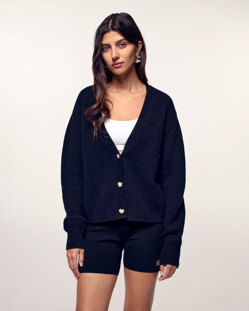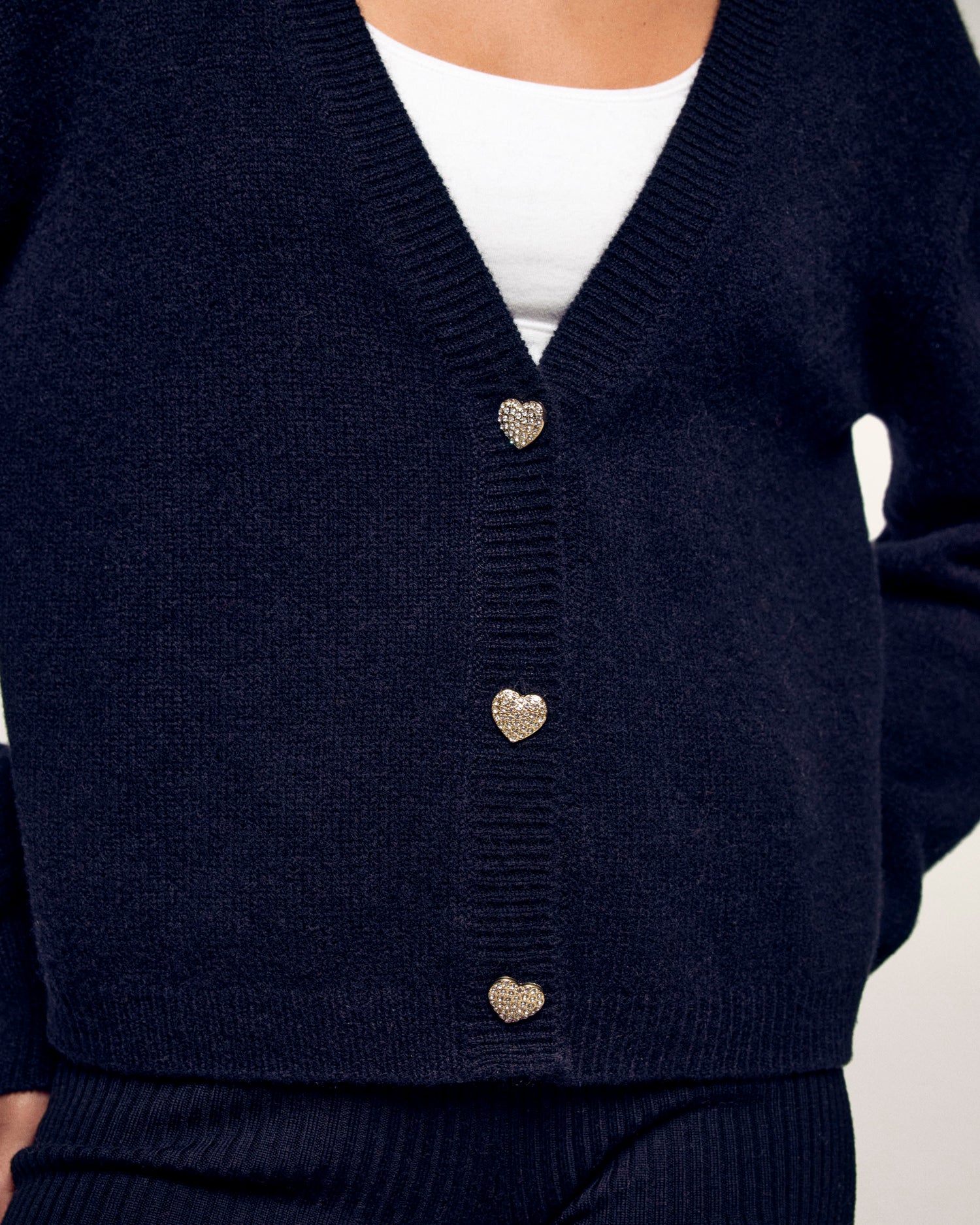 Realizzato in Cashmere 4 fili, questo cardigan offre una morbidezza e un calore premium. Il suo taglio corto e l'elegante scollo a V sono impreziositi da bottoni fantasia a forma di cuore dorato, per un dettaglio chic e femminile.