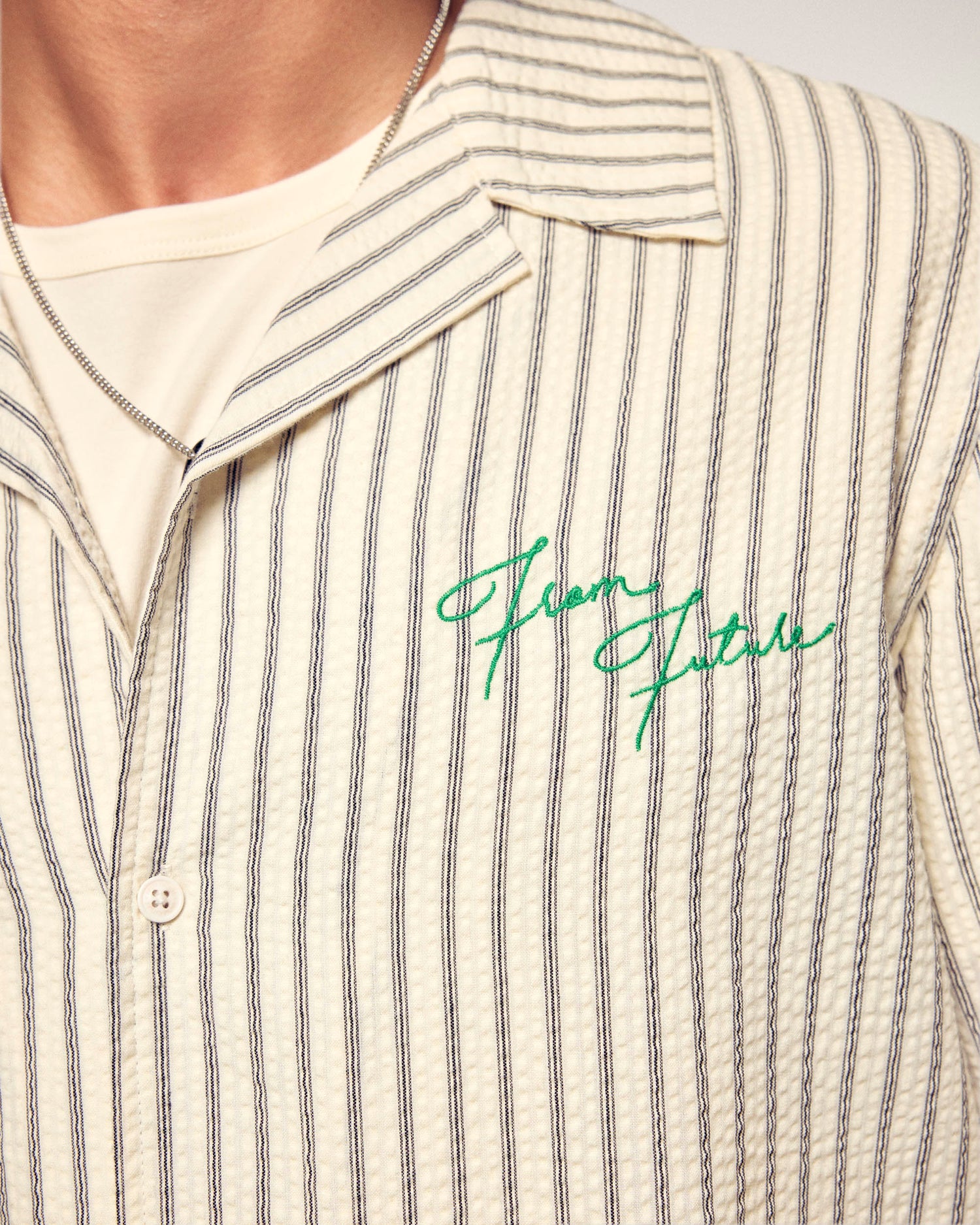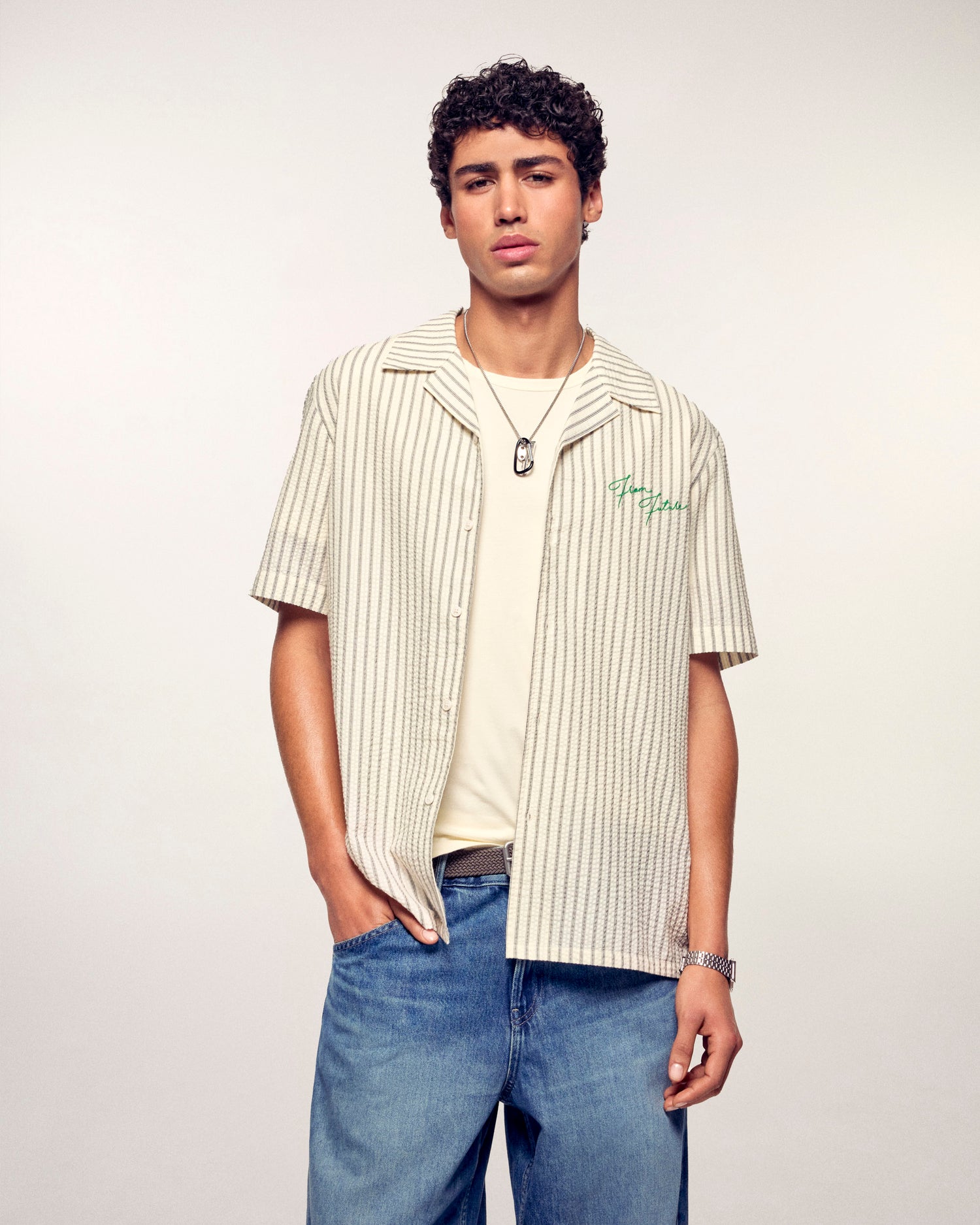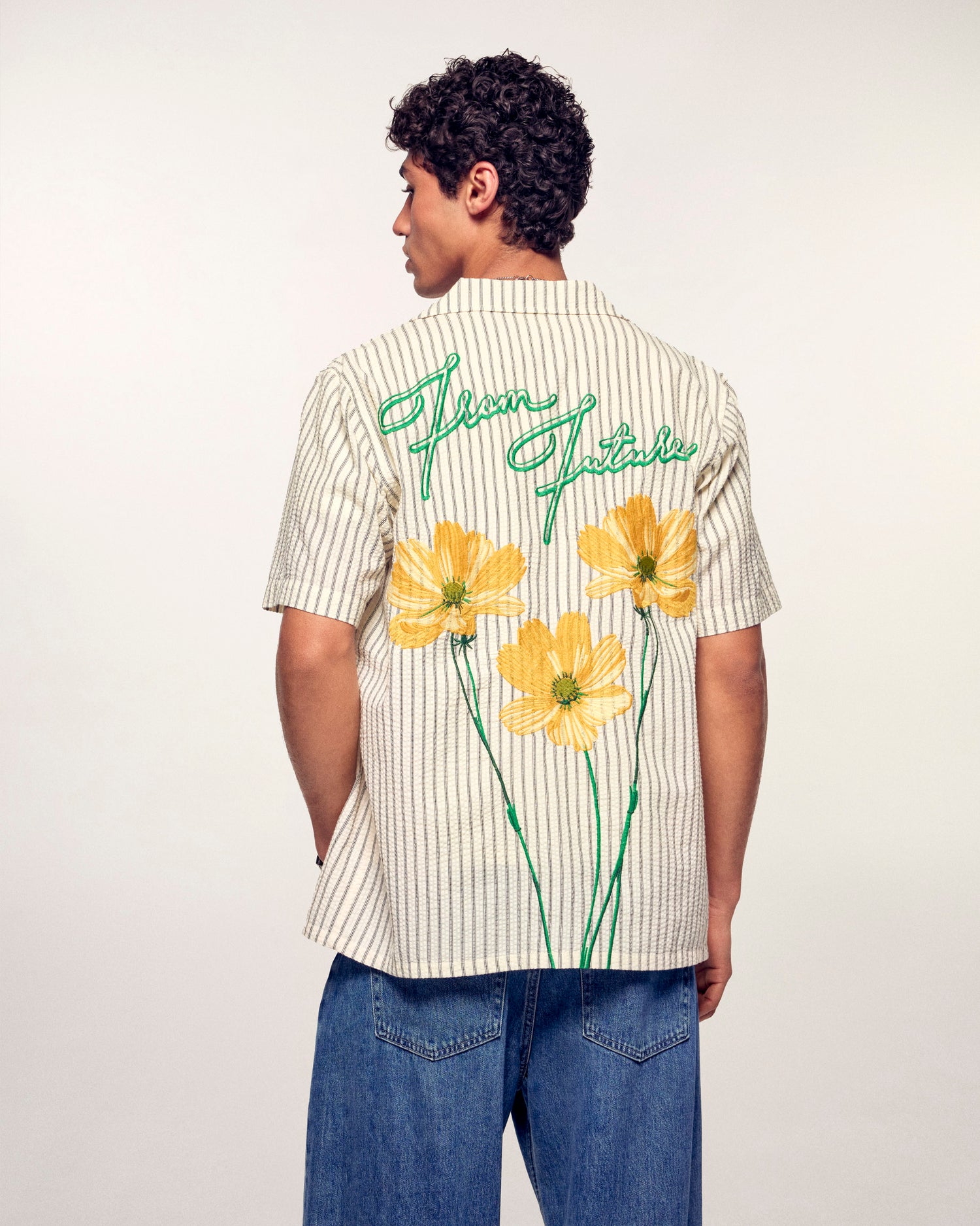 Il twist perfetto per l'estate. Questa camicia a maniche corte punta tutto sullo stile con le sue sottili righe e i motivi floreali ricamati sulla schiena. Un essenziale per un look casual, firmato From Future.
