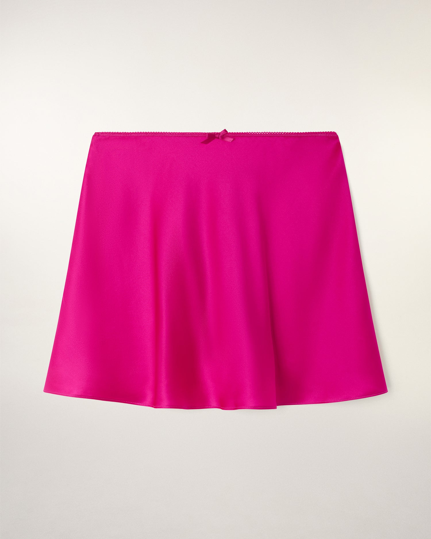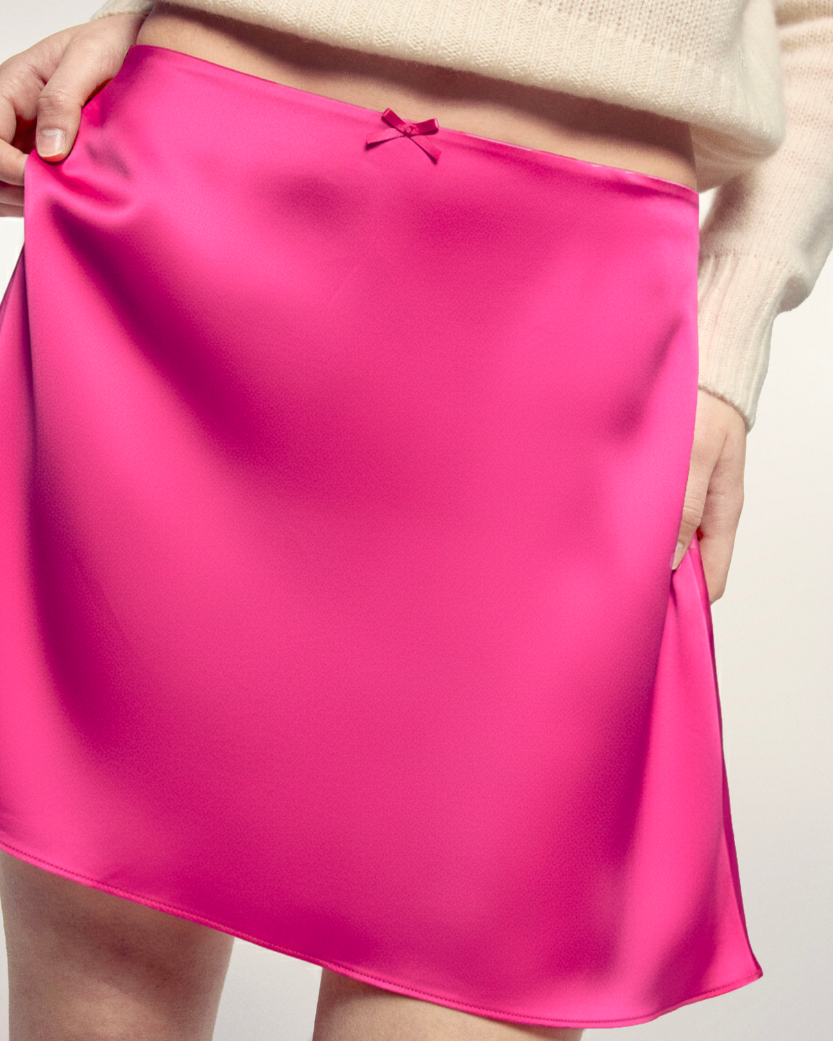 Una silhouette leggera e solare per questa minigonna realizzata in raso di seta. Si distingue per il delicato dettaglio del nodo in vita nel centro davanti, offrendo un'allure al tempo stesso fresca e sofisticata per le vostre giornate estive.