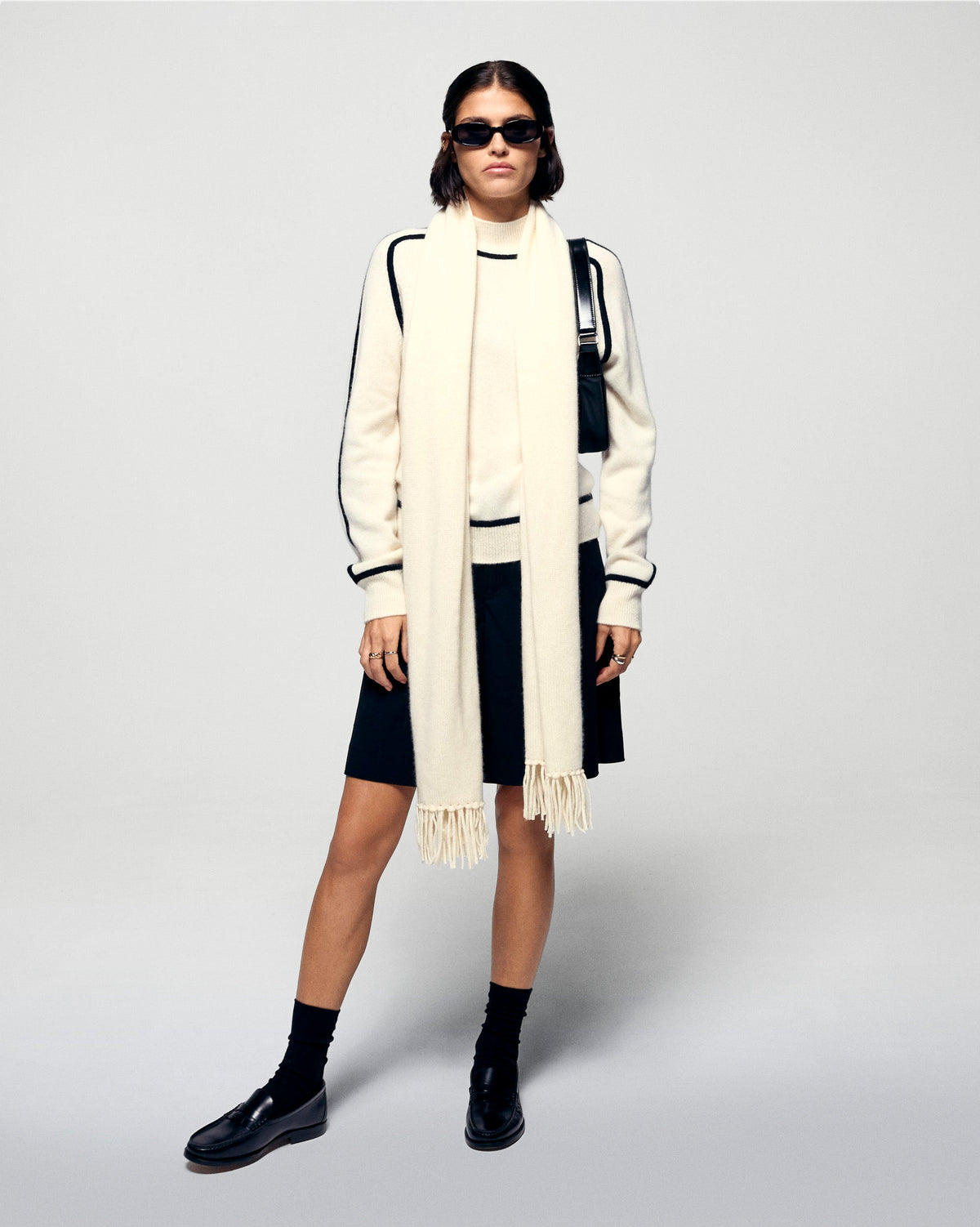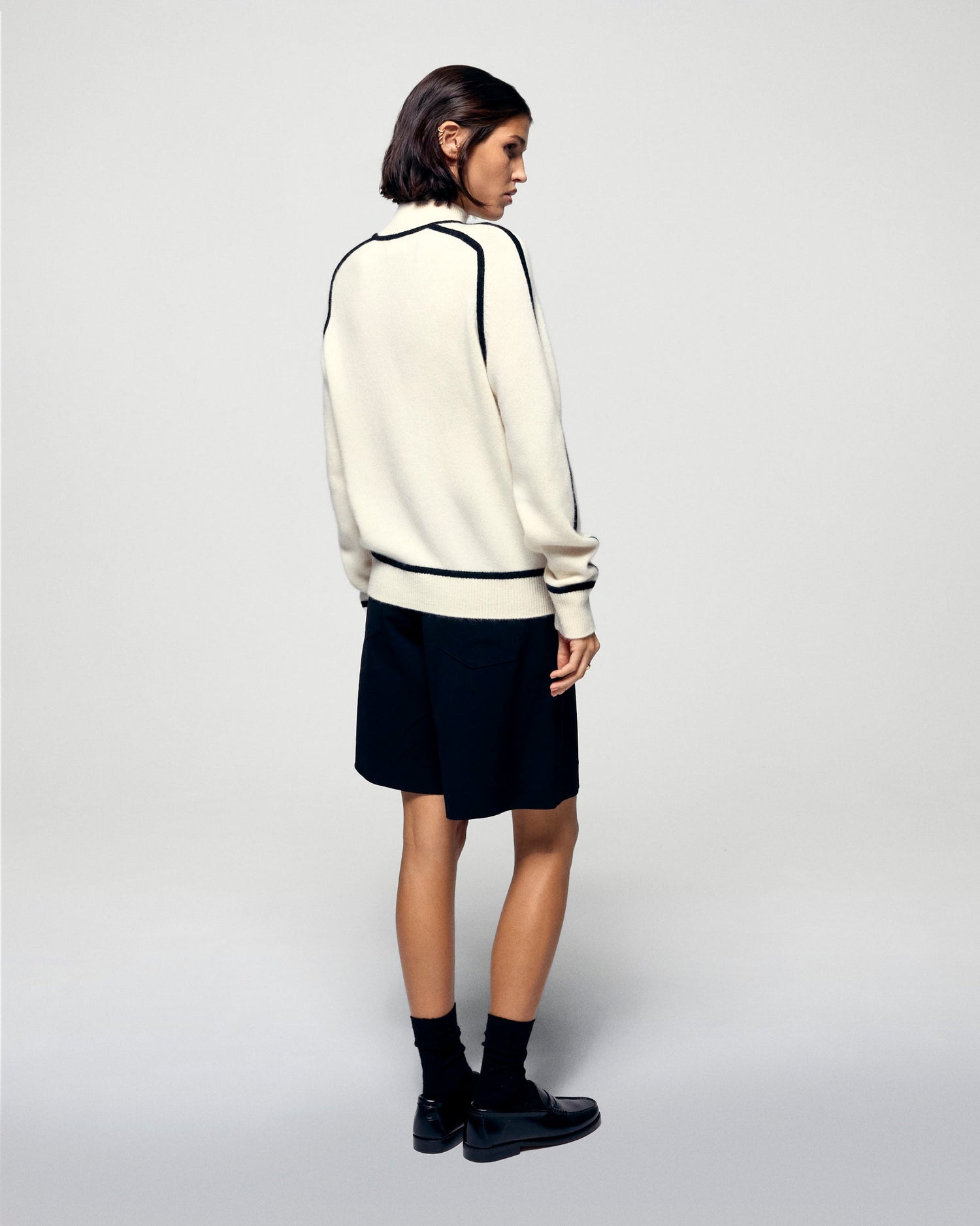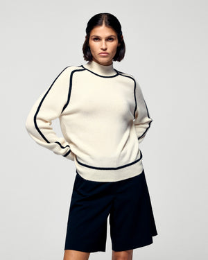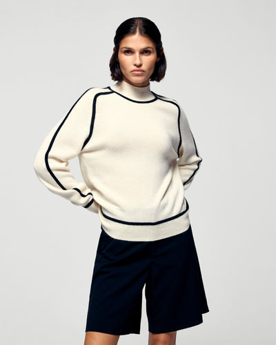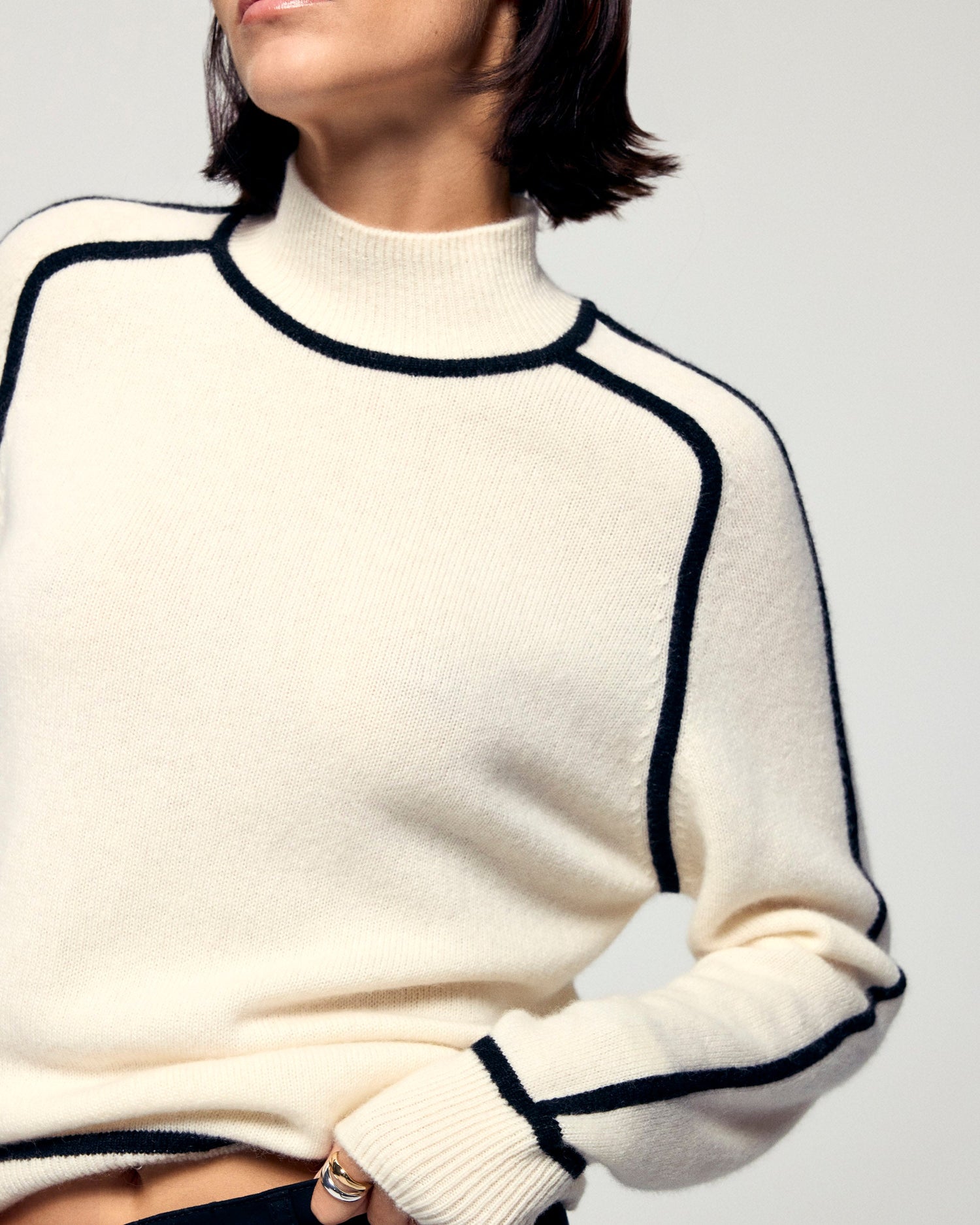 Il nostro iconico maglione in Cashmere è vivacizzato da audaci linee a contrasto. Il collo alto, le maniche lunghe e i bordi a coste disegnano un look strutturato, perfetto per affermare il tuo stile in questa stagione. Indossalo con un paio di pantaloni a gamba larga o una gonna corta per un look chic e casual!