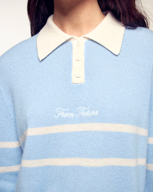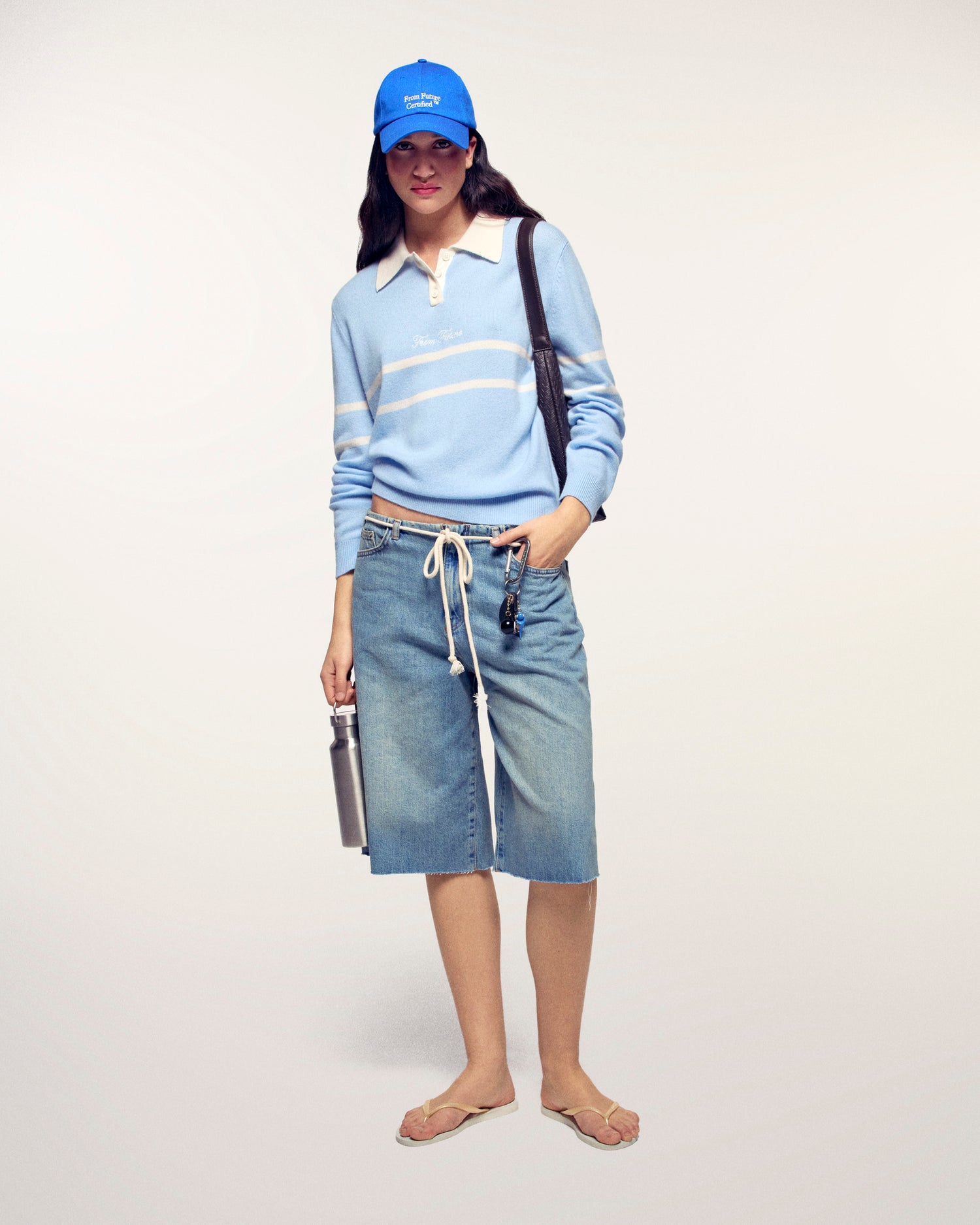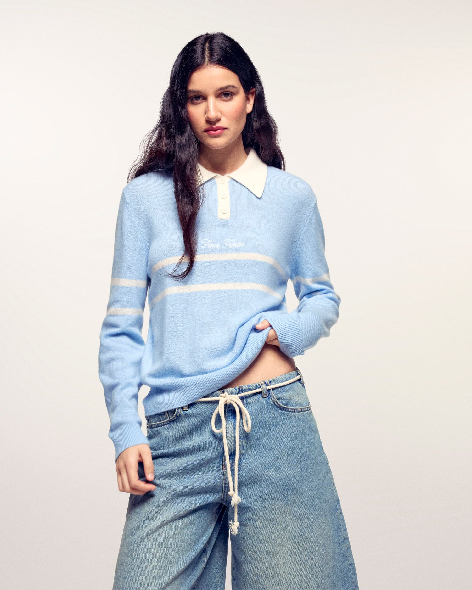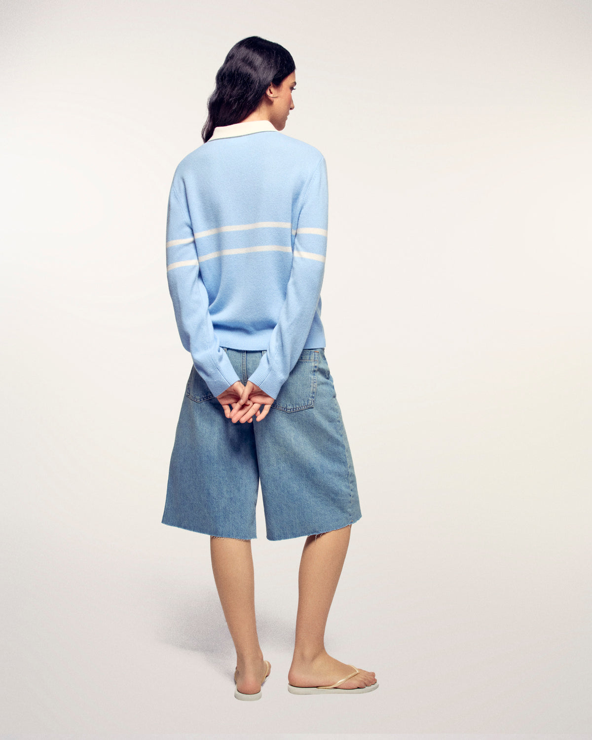 Un capo dall'allure sport-chic e dallo stile vintage, ideale per donare un tocco di freschezza al vostro guardaroba. Questo maglione in cashmere si distingue per il collo polo a contrasto e le bande orizzontali sul petto e sulle maniche, impreziositi da un ricamo signature per una silhouette moderna e curata.