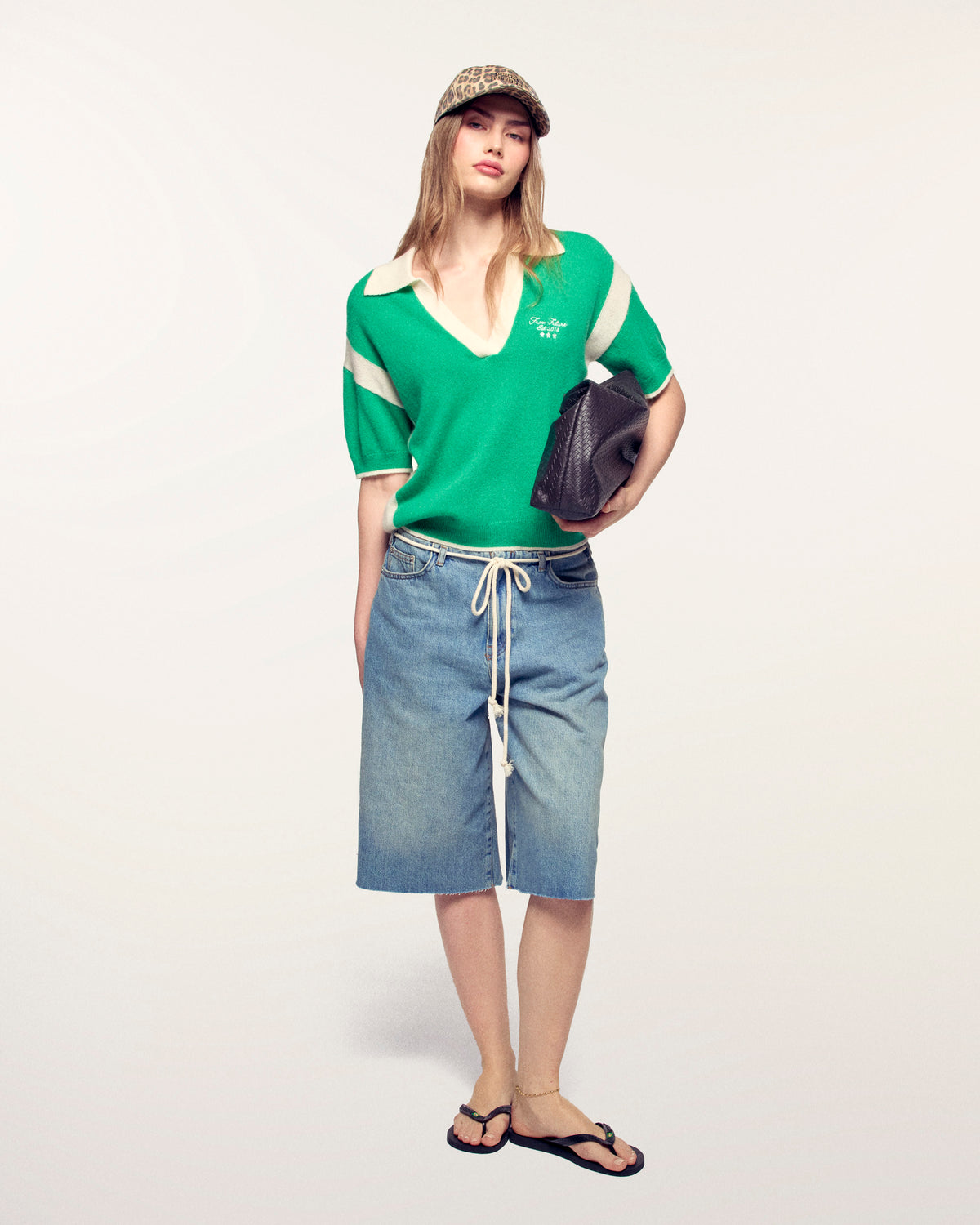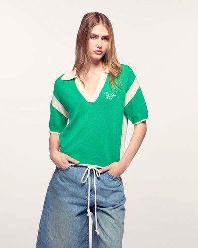 La polo in maglia rivisitata con un tocco sportswear. Realizzato in Cashmere 2 fili, offre una morbidezza e una leggerezza ideali. Il suo taglio regular intramontabile è caratterizzato da un ampio colletto polo a V a contrasto e ricami a punto catenella, firma del brand.