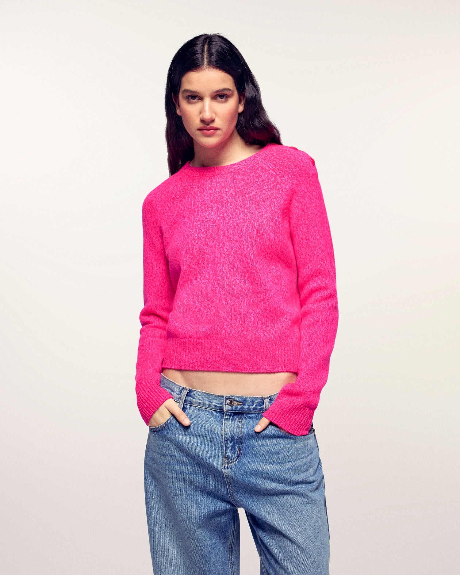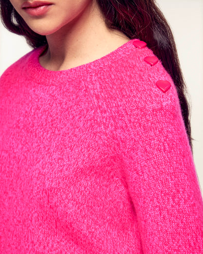 Un capo caldo dal finissaggio melange, ideale per donare un tocco di morbidezza e fantasia alla vostra quotidianità. Questo maglione si distingue per i bottoni a forma di cuore sull'apertura della spalla, offrendo una silhouette al tempo stesso moderna e romantica.