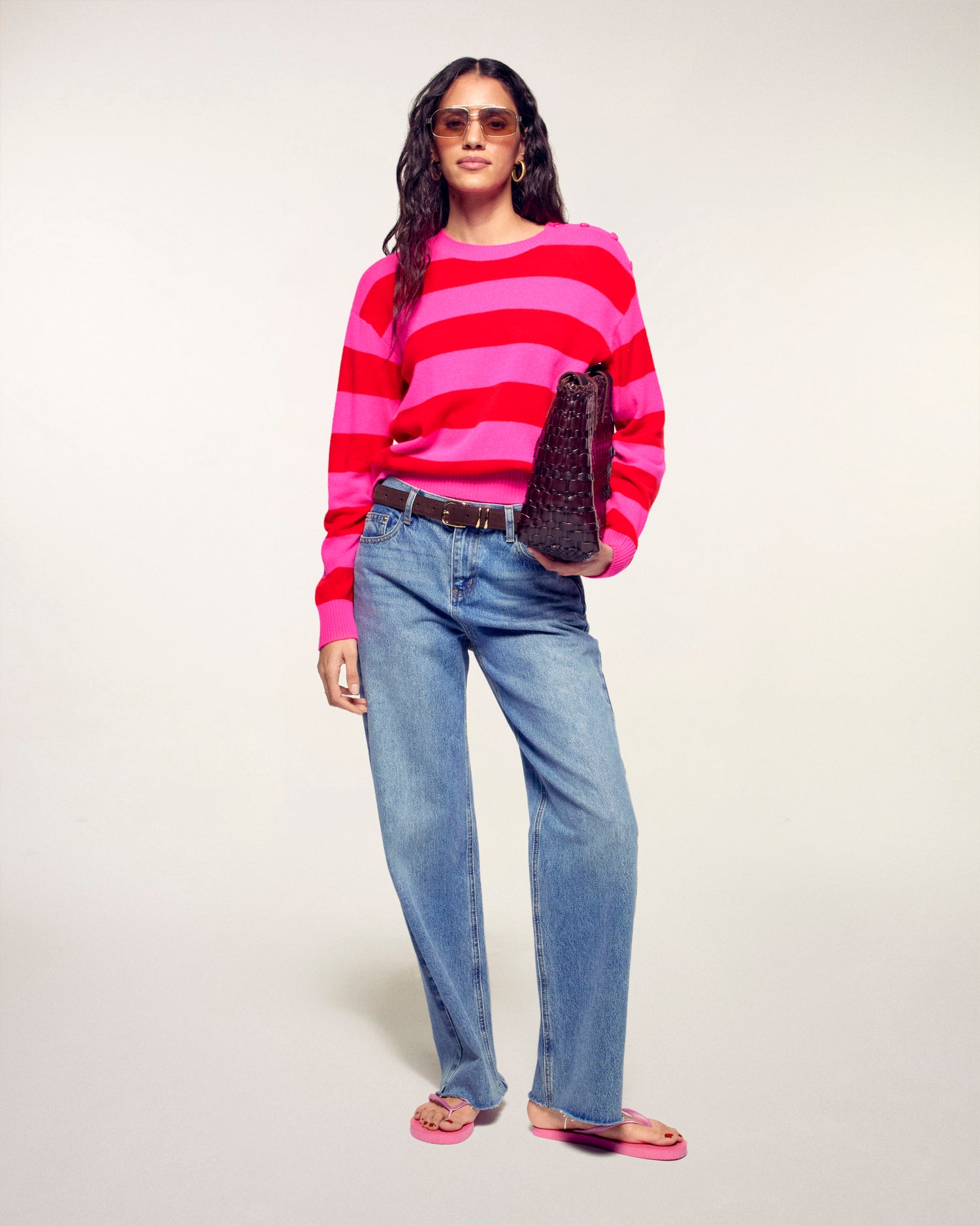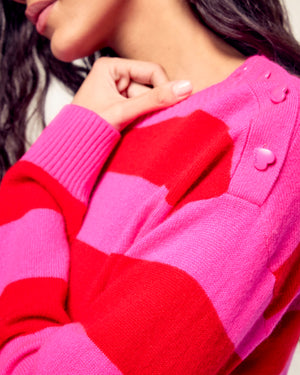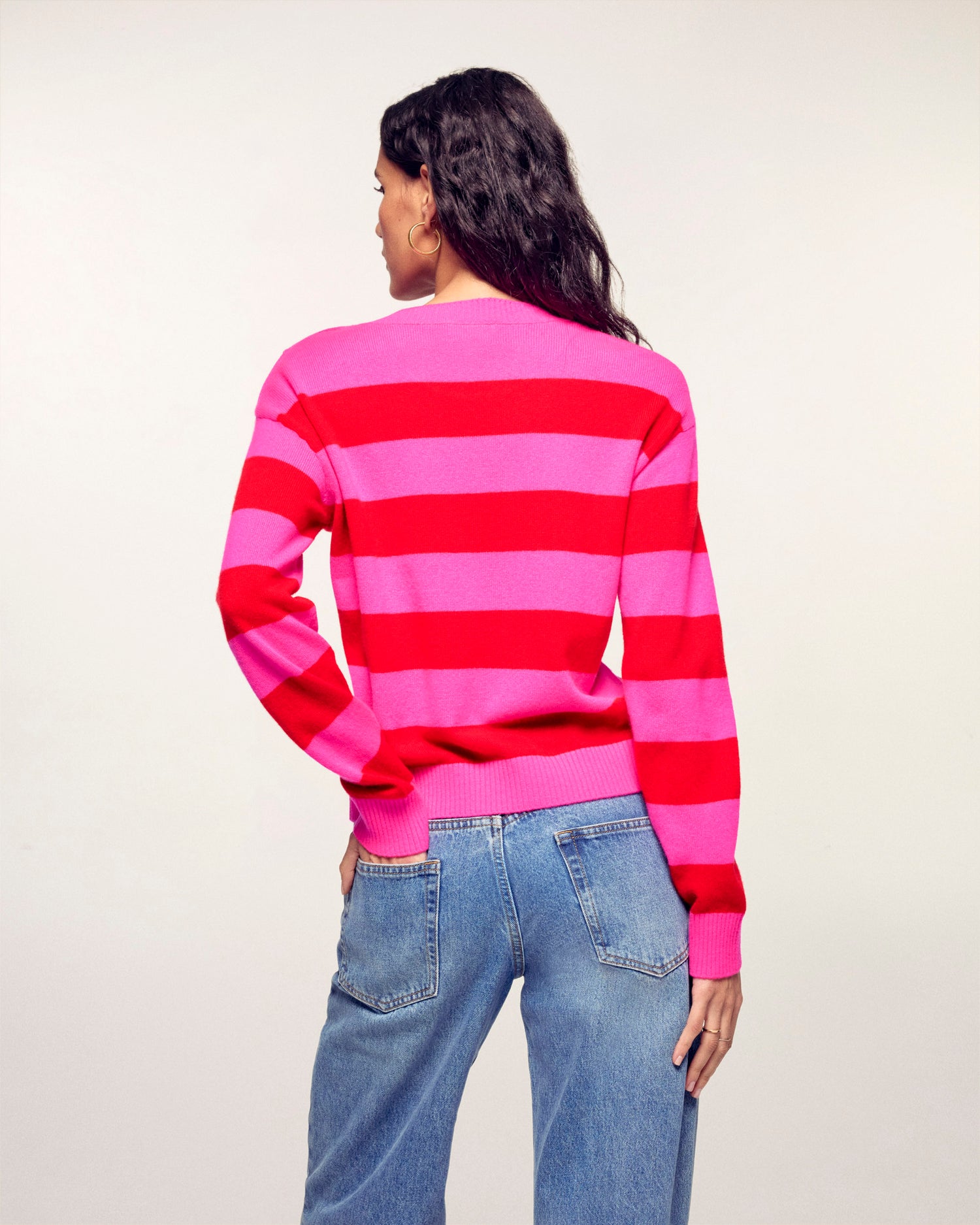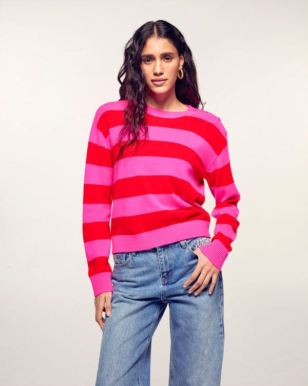 Un capo dal fascino romantico e grafico, ideale per illuminare il vostro guardaroba di stagione. Questo maglione in cashmere si distingue per le sue righe bicolore vibranti e i bottoni dorati a forma di cuore sulla spalla, offrendo un'allure al tempo stesso dolce e audace.