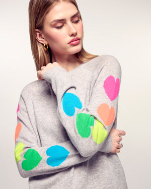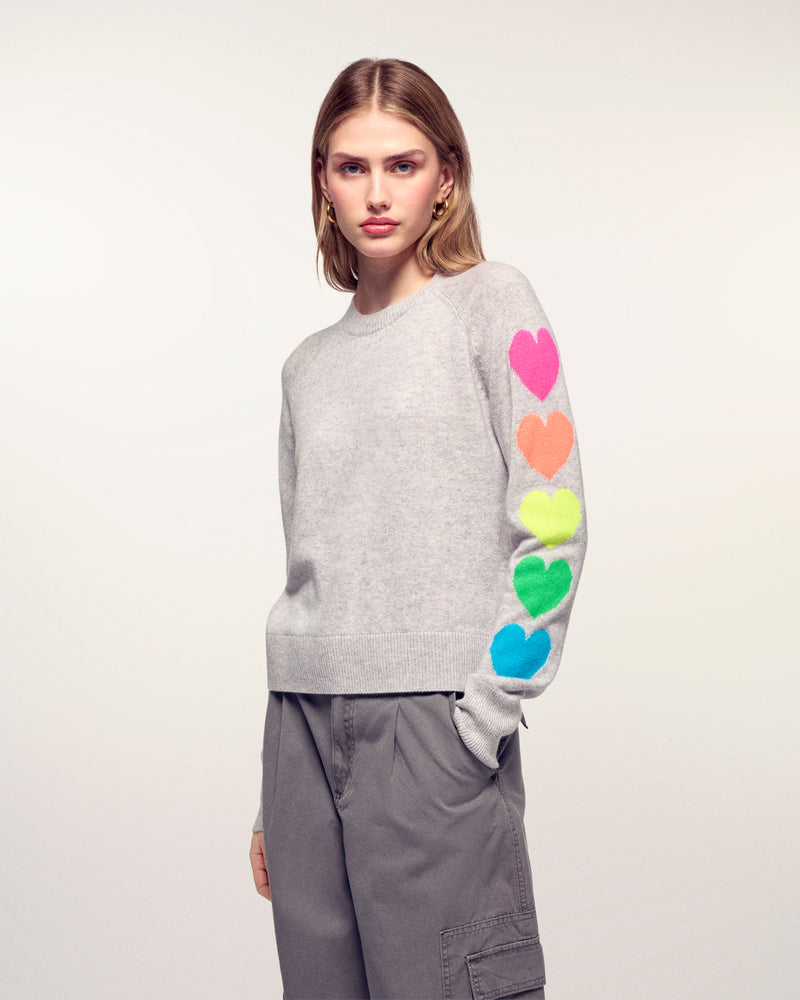 Une pièce à la fois douce et ludique qui apporte une touche de gaieté à votre vestiaire. Ce pull en cachemire léger se distingue par sa série de motifs cœurs multicolores sur le long des manches, offrant une silhouette moderne et pleine de fantaisie.