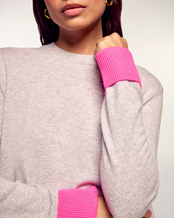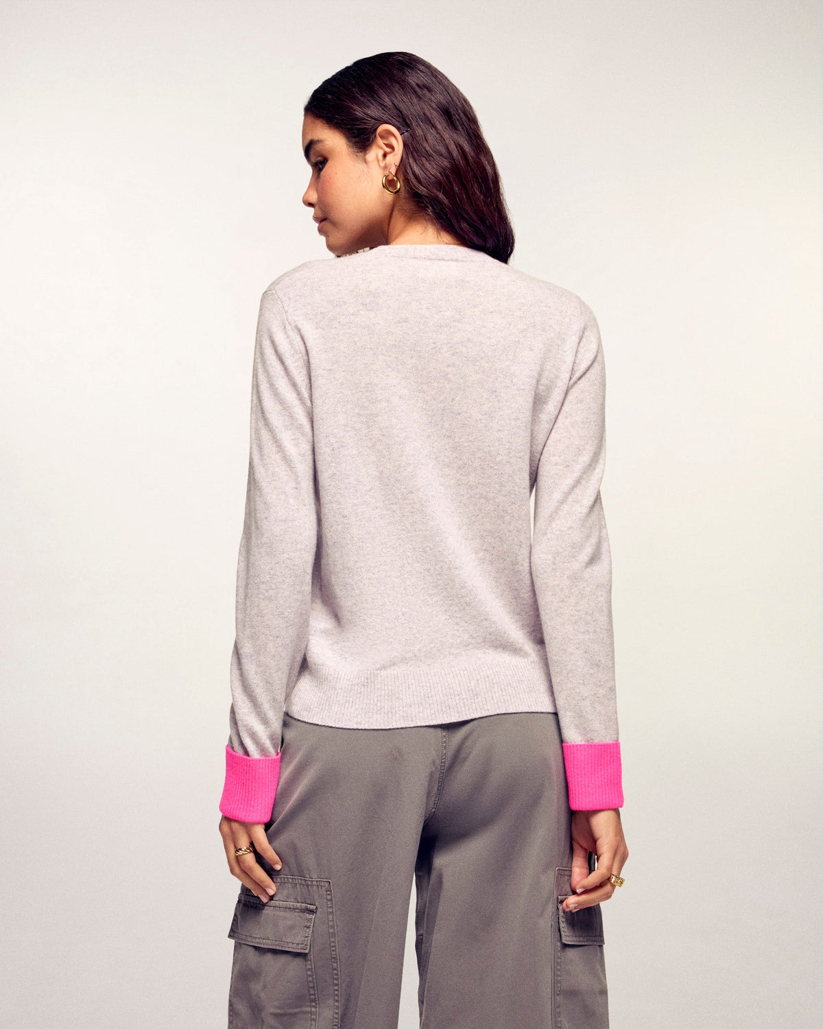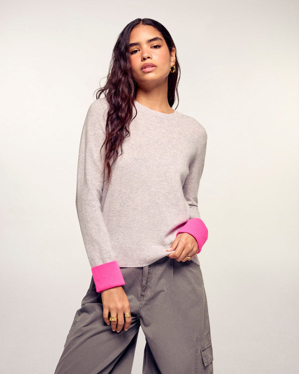 Un classico rivisitato con eleganza per questo maglione a girocollo realizzato in puro cashmere 2 fili. Si distingue per le finiture bicolore a contrasto su collo, polsi e fondo, che donano un tocco grafico e moderno alla sua silhouette aderente. Un capo dalla morbidezza eccezionale, ideale per un look quotidiano raffinato.