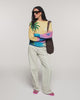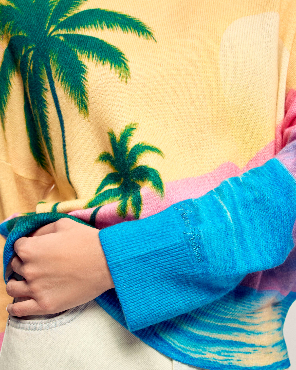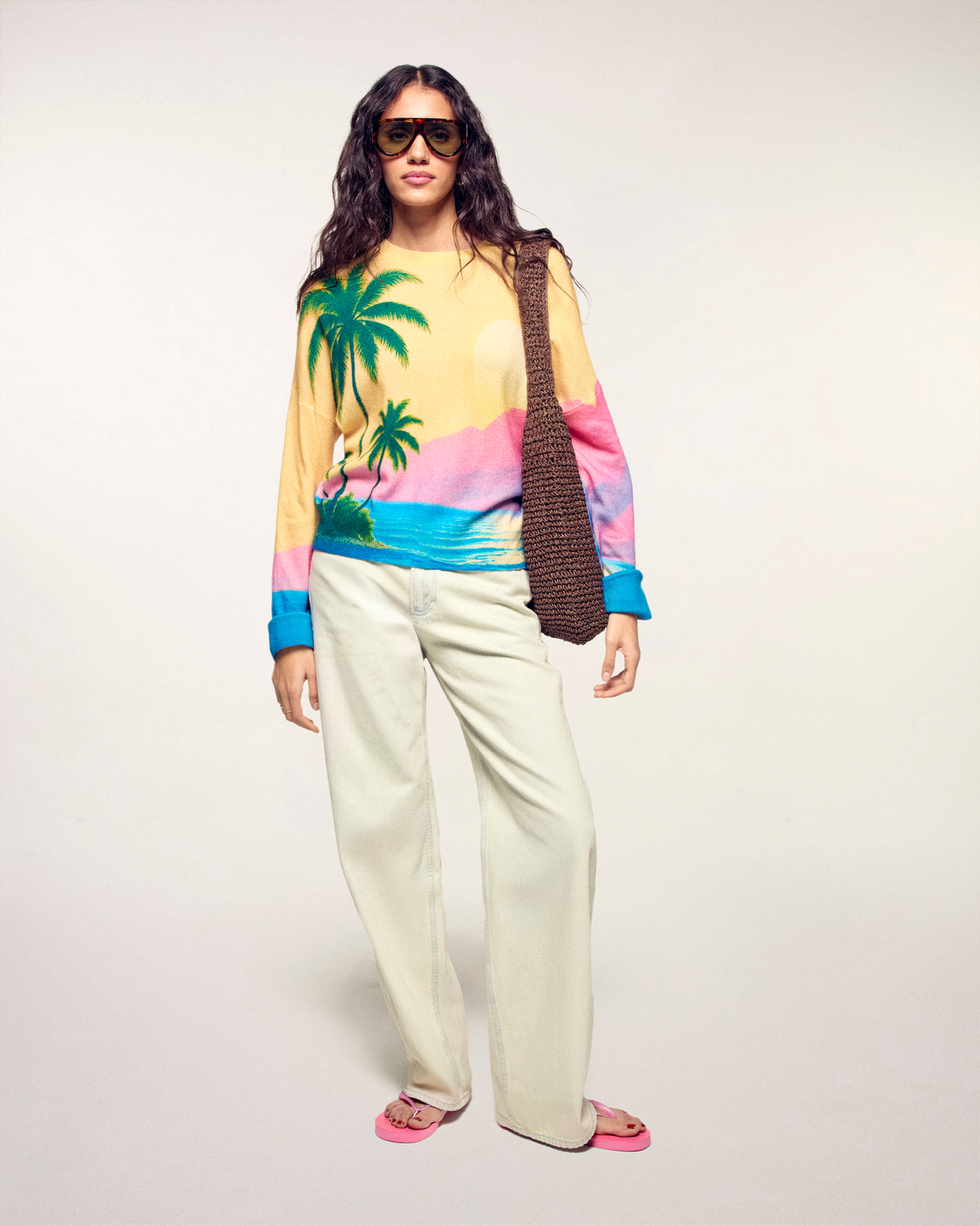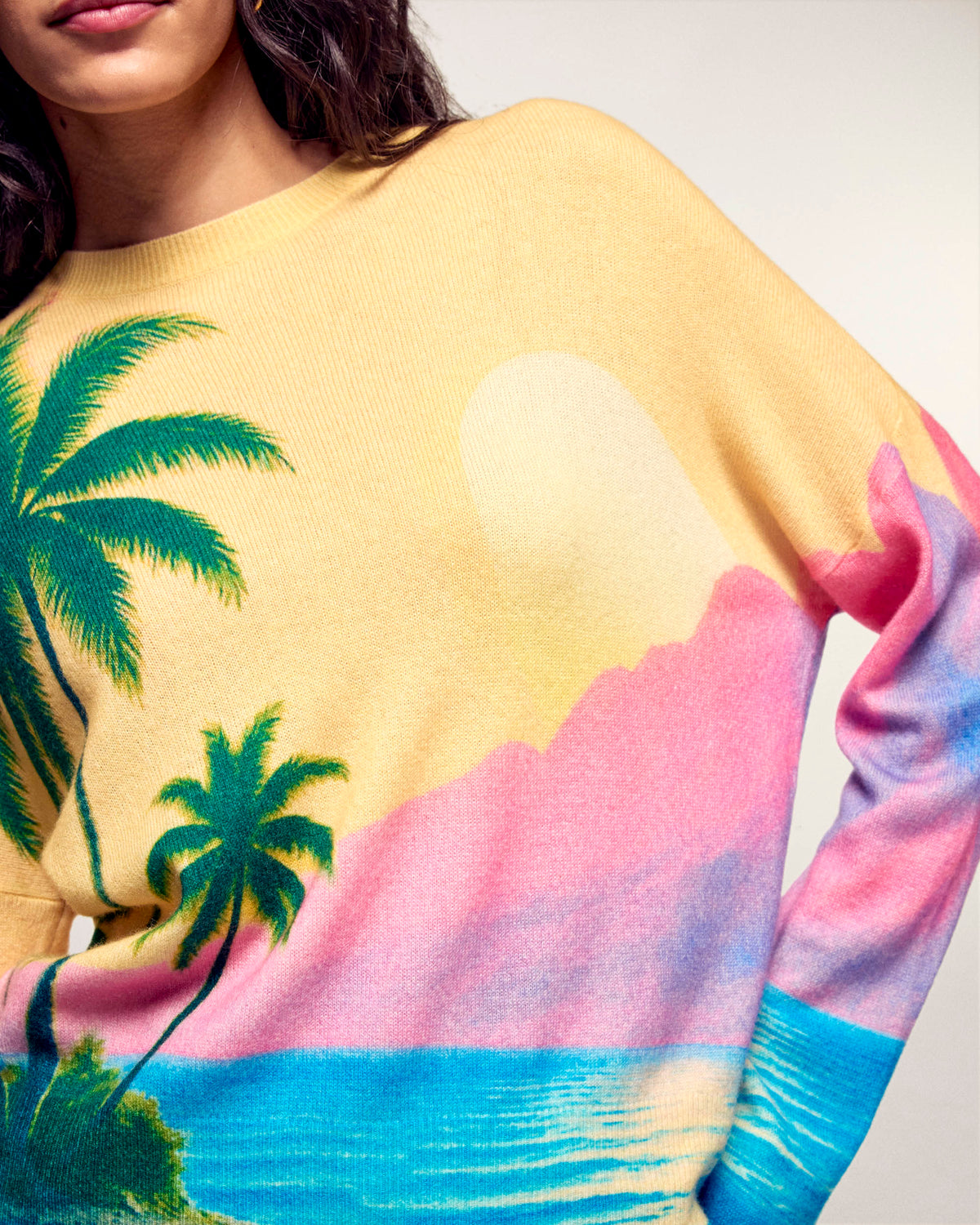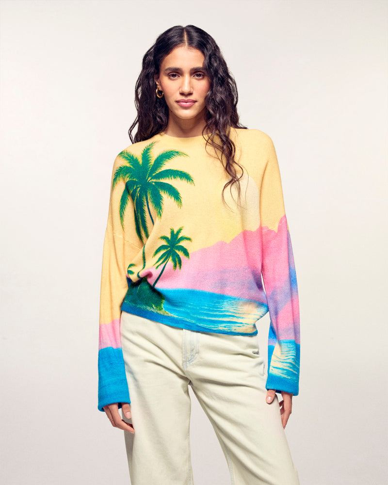 Il maglione che ti trasporta direttamente ai tropici. Realizzato in Cashmere 2 fili, questo maglione girocollo offre una maglia morbida e leggera. Il suo taglio oversize è messo in risalto da una vivace stampa all-over che rappresenta un tramonto e delle palme.