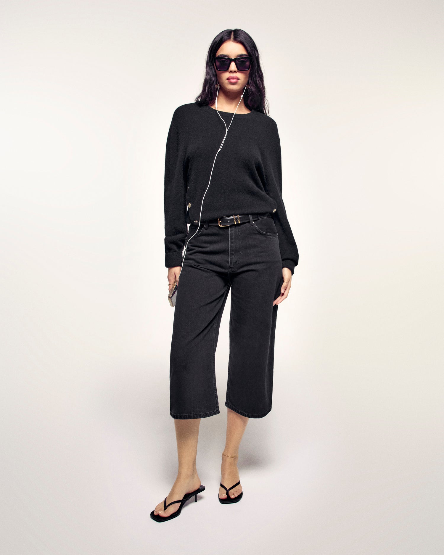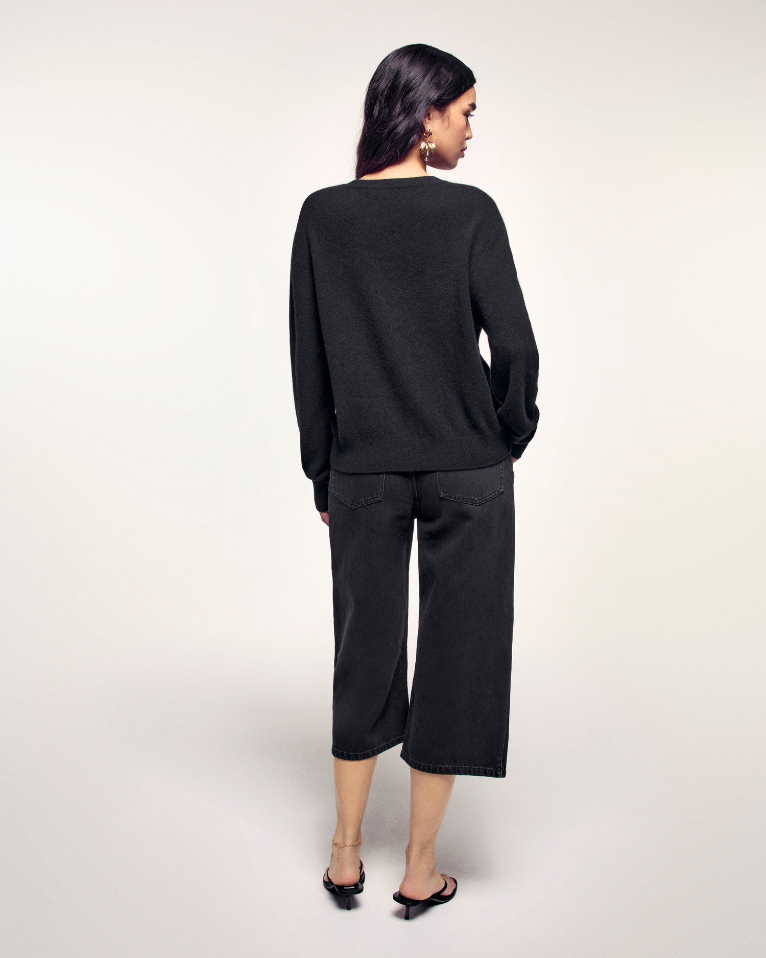 Il maglione che dona un tocco di fantasia chic. Realizzato in Cashmere 2 fili, questo maglione girocollo offre una maglia morbida e leggera. Il suo taglio corto e regular è reso dinamico da due file di bottoni dorati a forma di cuore, che mettono in risalto l'inserto a V.