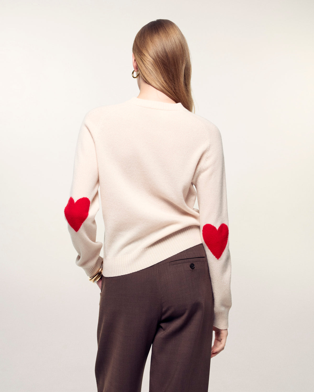 Il maglione che aggiunge un tocco di fantasia romantica. Realizzato in Cashmere 2 fili, questo maglione girocollo offre una maglia morbida e leggera. La sua vestibilità regular è resa dinamica dalle toppe sui gomiti in jacquard a forma di cuore che contrastano sulle maniche.