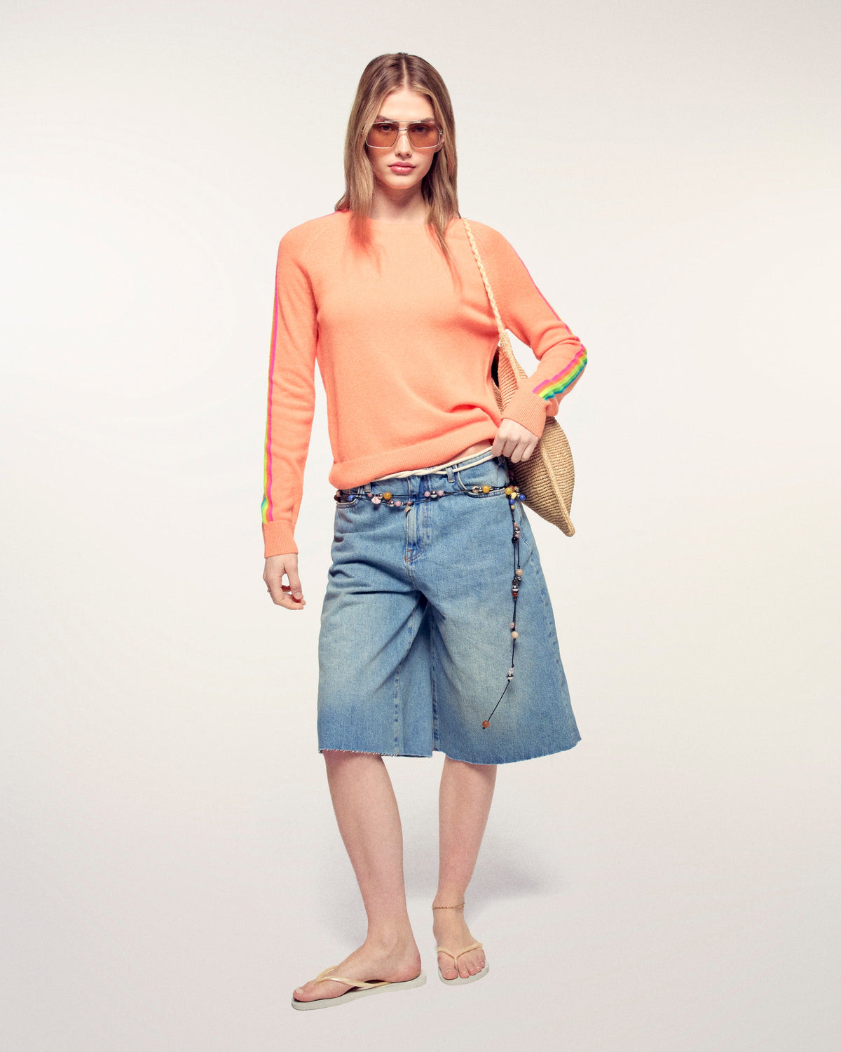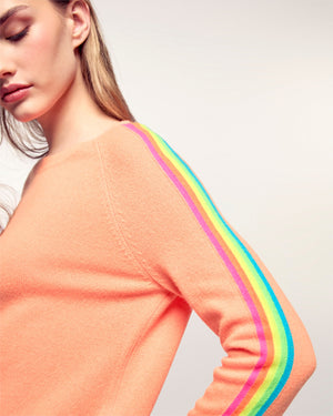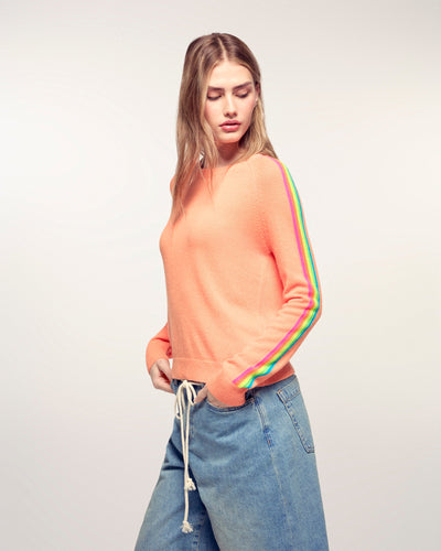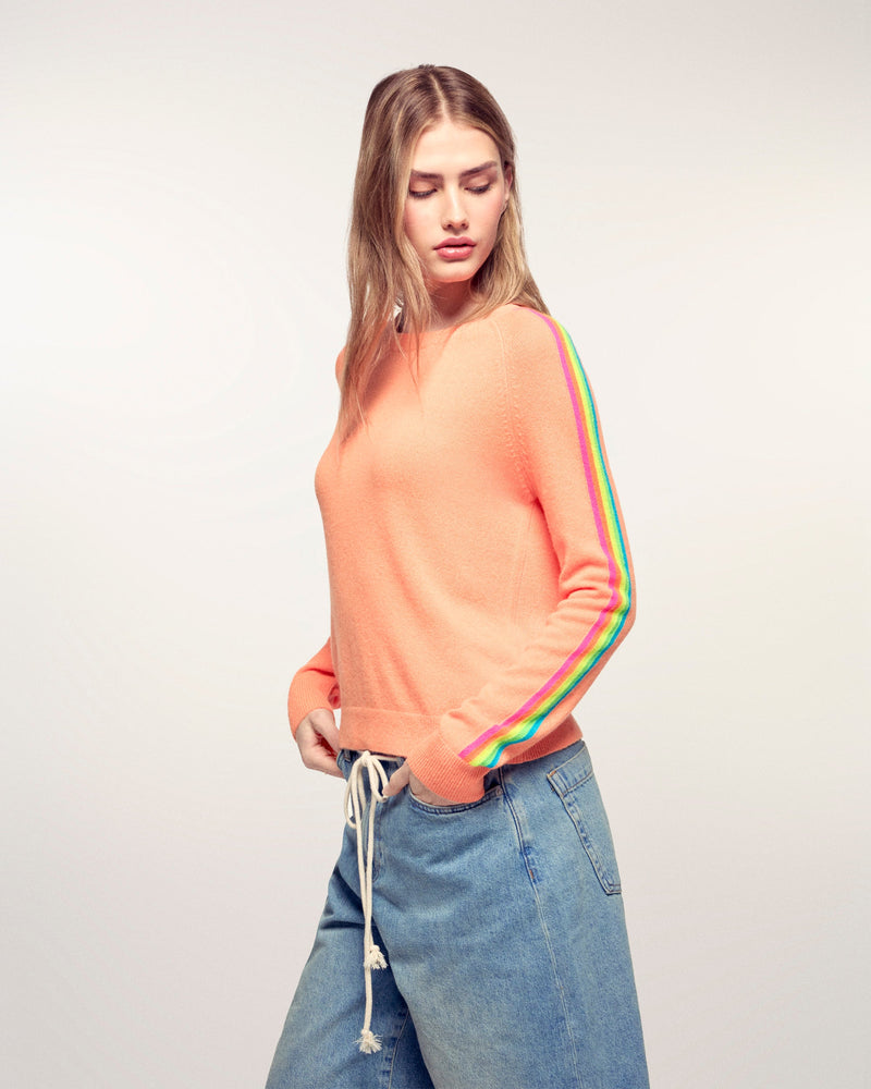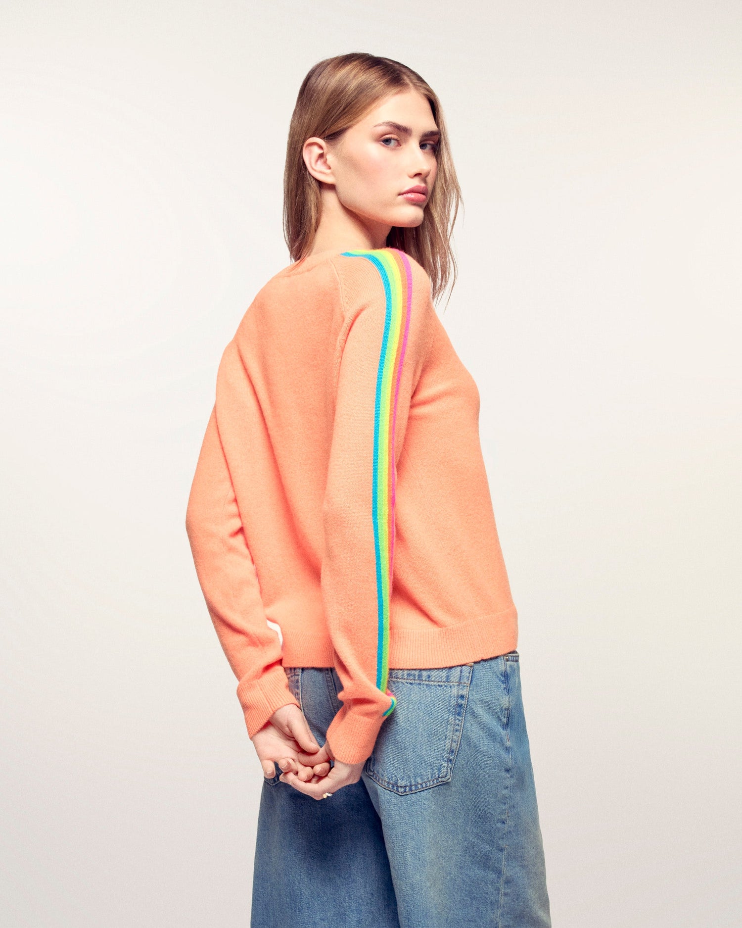 L'eleganza del cashmere incontra l'audacia dei colori con questo maglione girocollo. Realizzato in cashmere 2 fili, offre una morbidezza incomparabile e una leggerezza ideale. Le sue righe multicolore sulle maniche, vera firma del brand, dinamizzano il taglio regular per un look moderno e intramontabile.