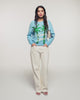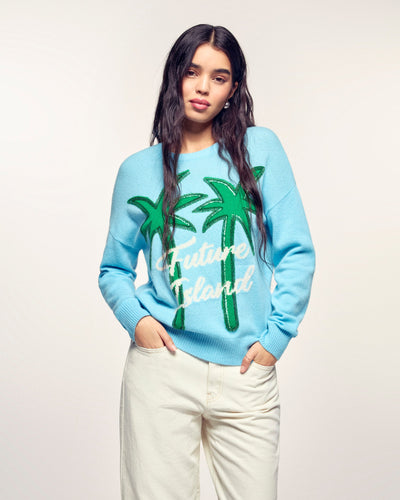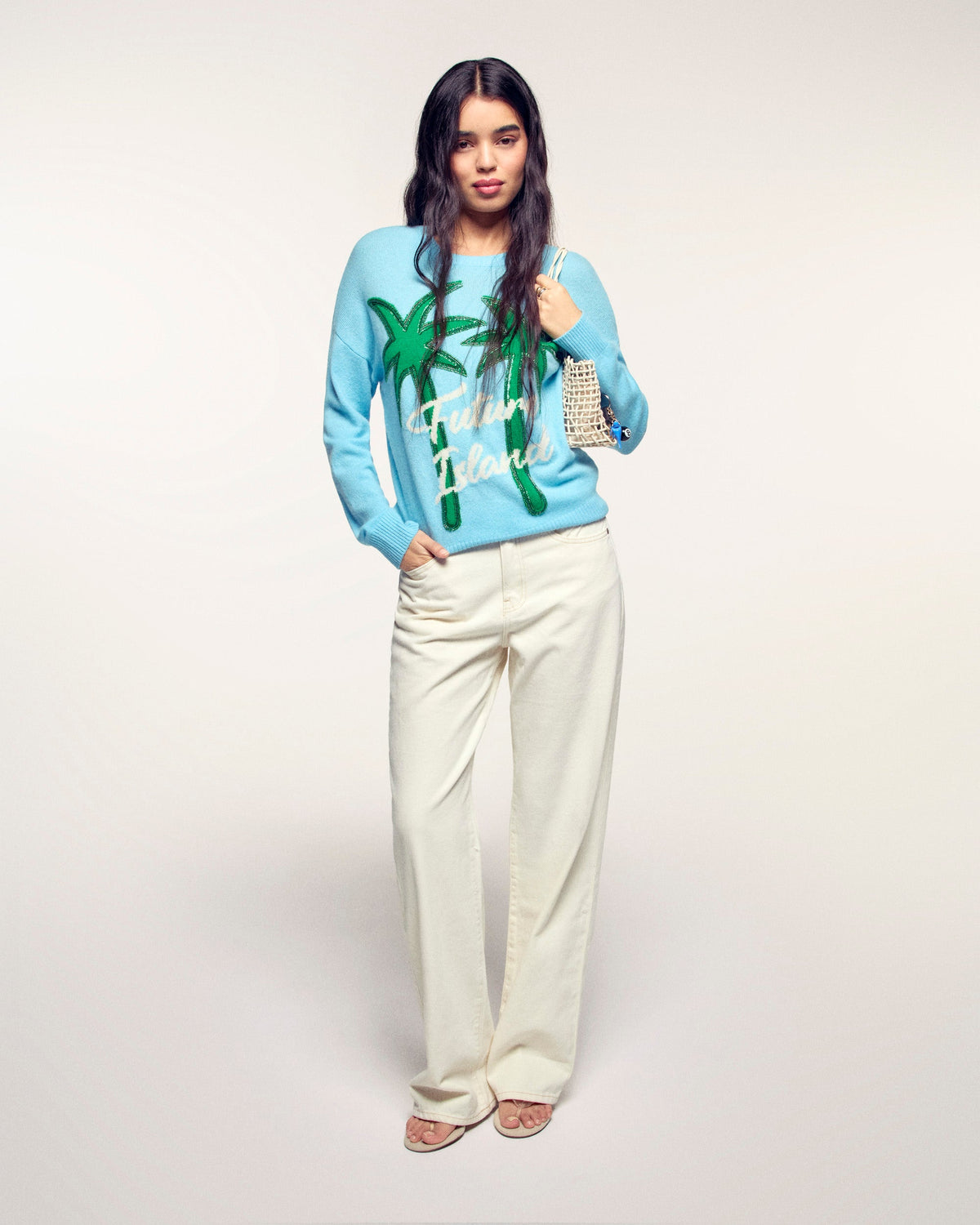 Un invito al viaggio con un tocco di lucentezza. Realizzato in Cashmere 2 fili, questo maglione girocollo offre una maglia morbida e leggera. Il suo taglio regular intramontabile è reso dinamico da un grande motivo "Future Island" in jacquard di palme, i cui contorni sono finemente impreziositi da un ricamo di perline a tubo e paillettes per un effetto scintillante.