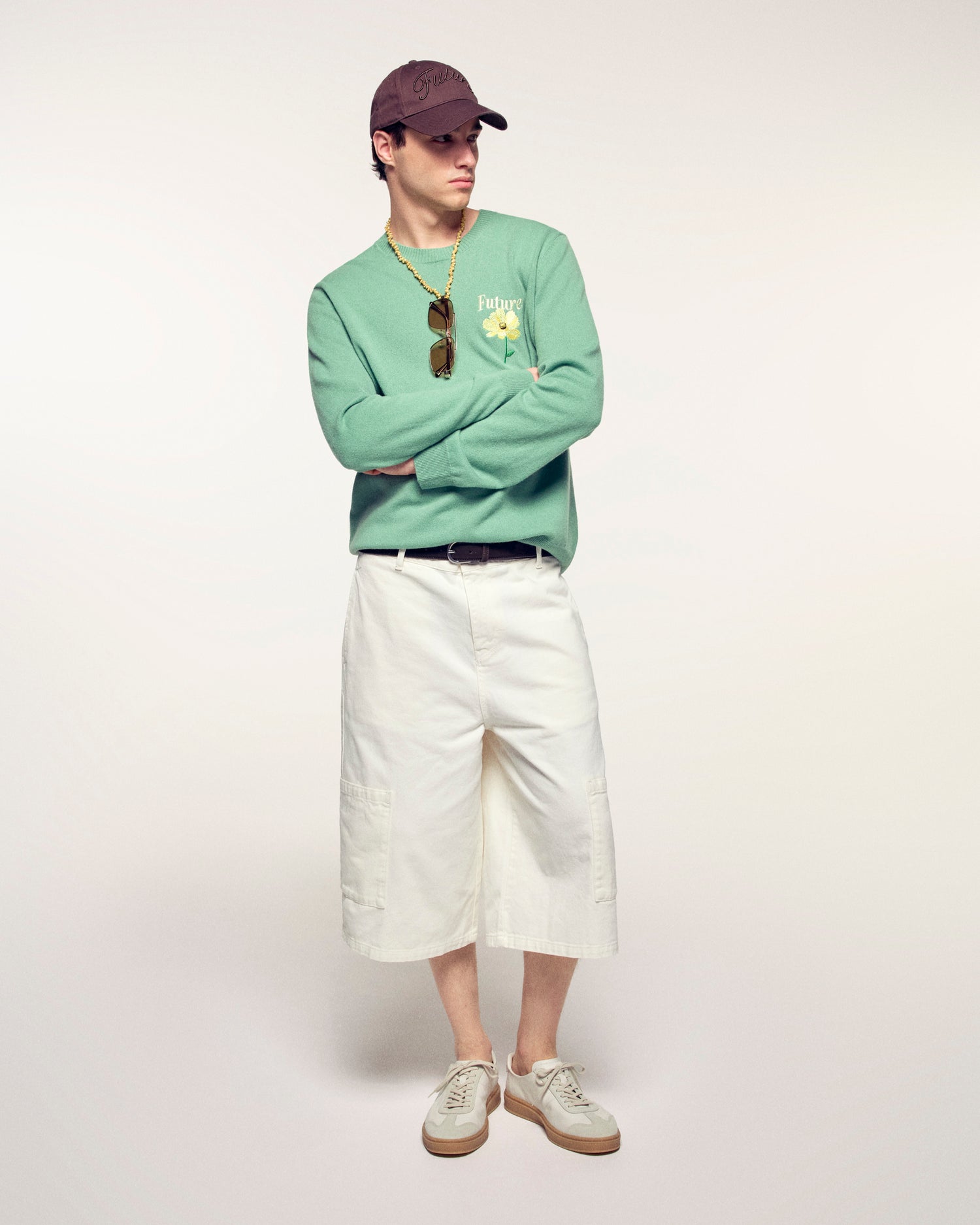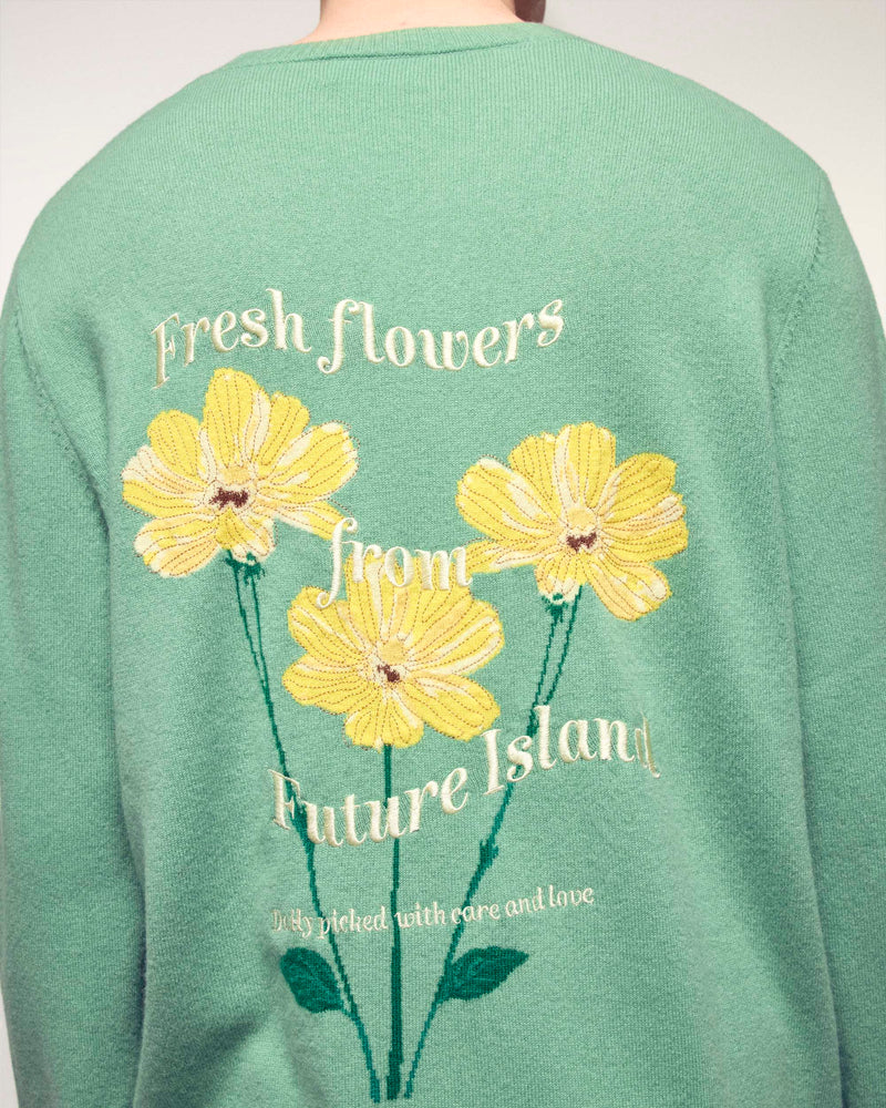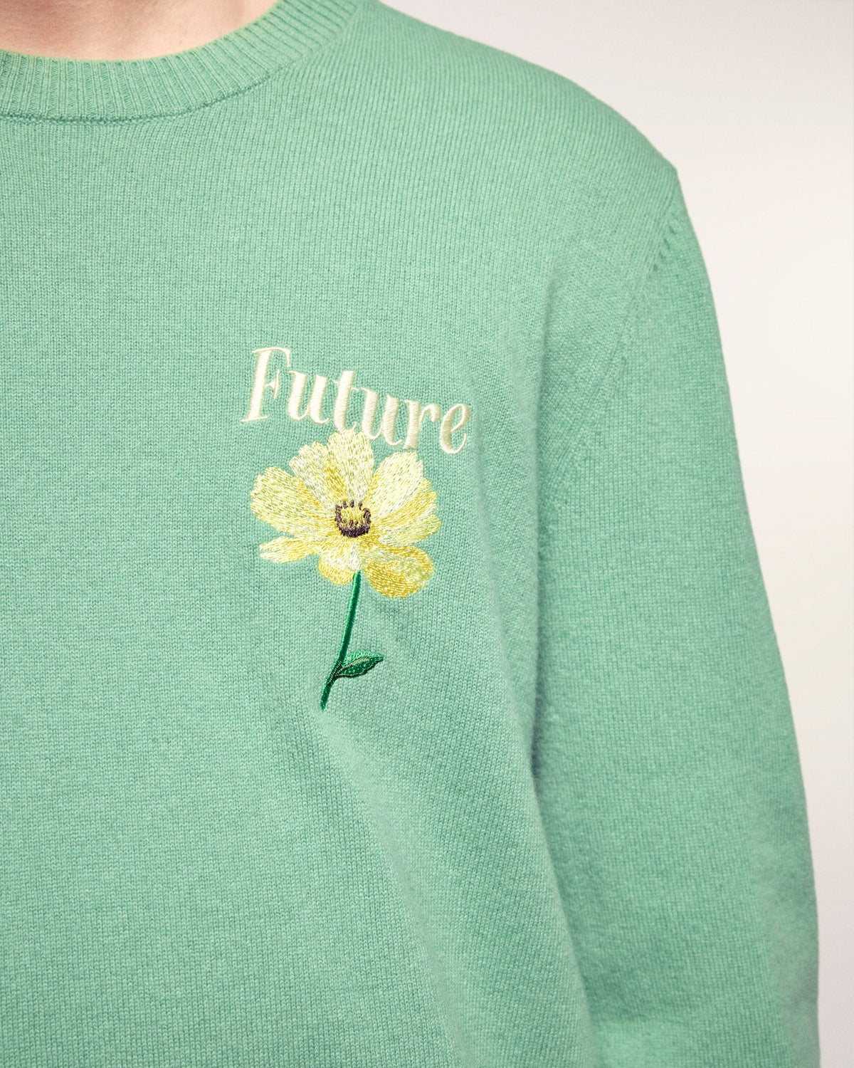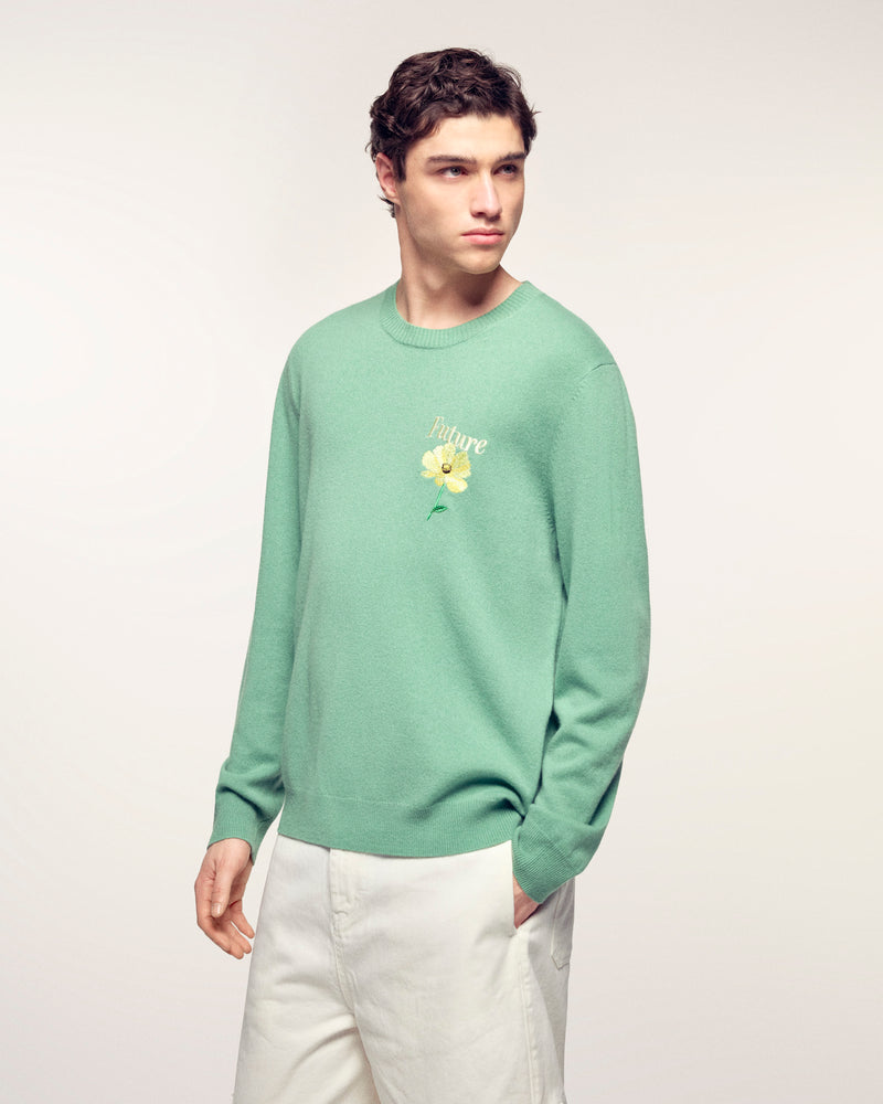 Il maglione che dona un tocco di originalità al tuo look. Realizzato in Cashmere 2 fili, offre un comfort impareggiabile. Questo maglione si distingue per il suo grande motivo jacquard floreale e il messaggio ricamato sul retro, affermando uno stile eccentrico e artistico.