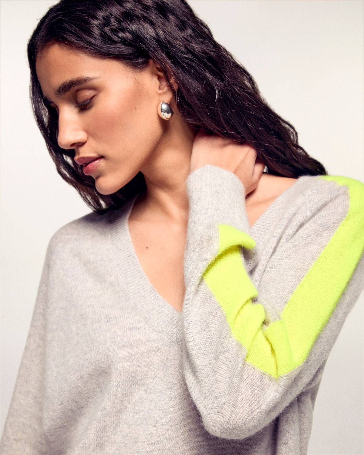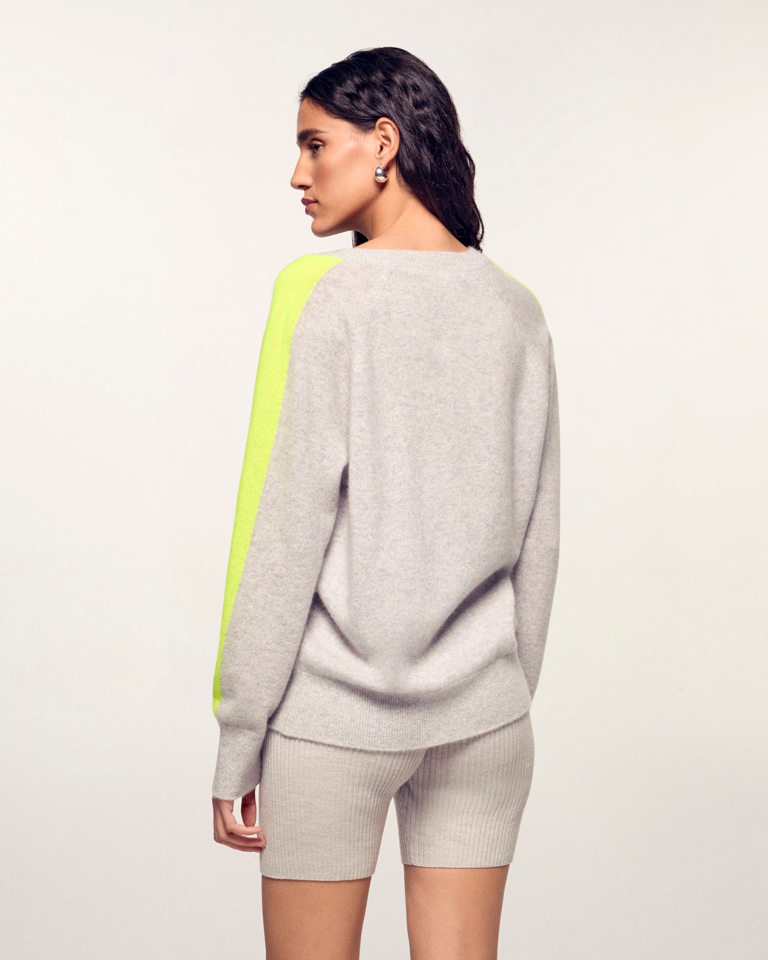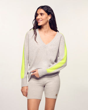 Una leggera e morbida maglia in cashmere 2 fili è protagonista di questo maglione corto e oversize. Con bordi a coste e uno scollo a V, presenta bande multicolori lungo le maniche per strutturare il tuo look con eleganza. Con colori vivaci, completa il tuo look con una gonna satinata o un paio di jeans casual!