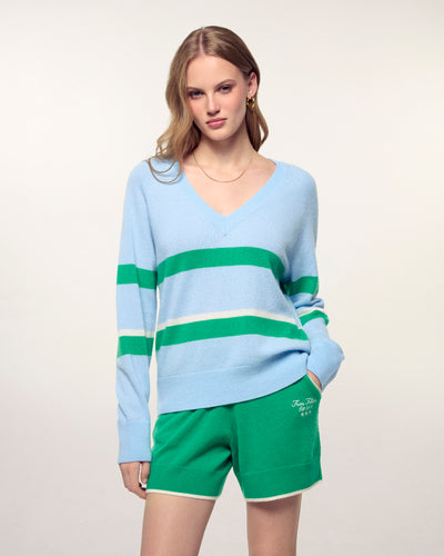 Maglione Scollo a V a Righe Bicolore - 100% Cashmere - Verificato GCS - Baby Blue