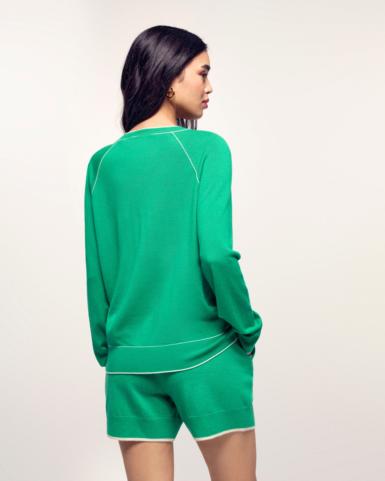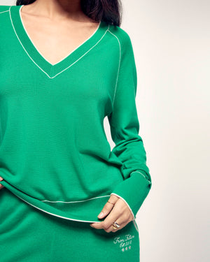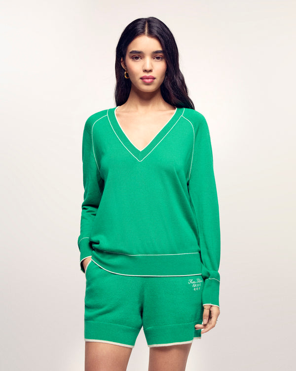 Il maglione con scollo a V che valorizza il tuo outfit. Realizzato in Lana Merinos Extrafine 2 fili, questo maglione offre una maglia morbida e leggera. Il suo taglio regular intramontabile è reso dinamico da profili a contrasto che incorniciano il collo, mettono in risalto il giro manica raglan e rifiniscono i bordi a coste.