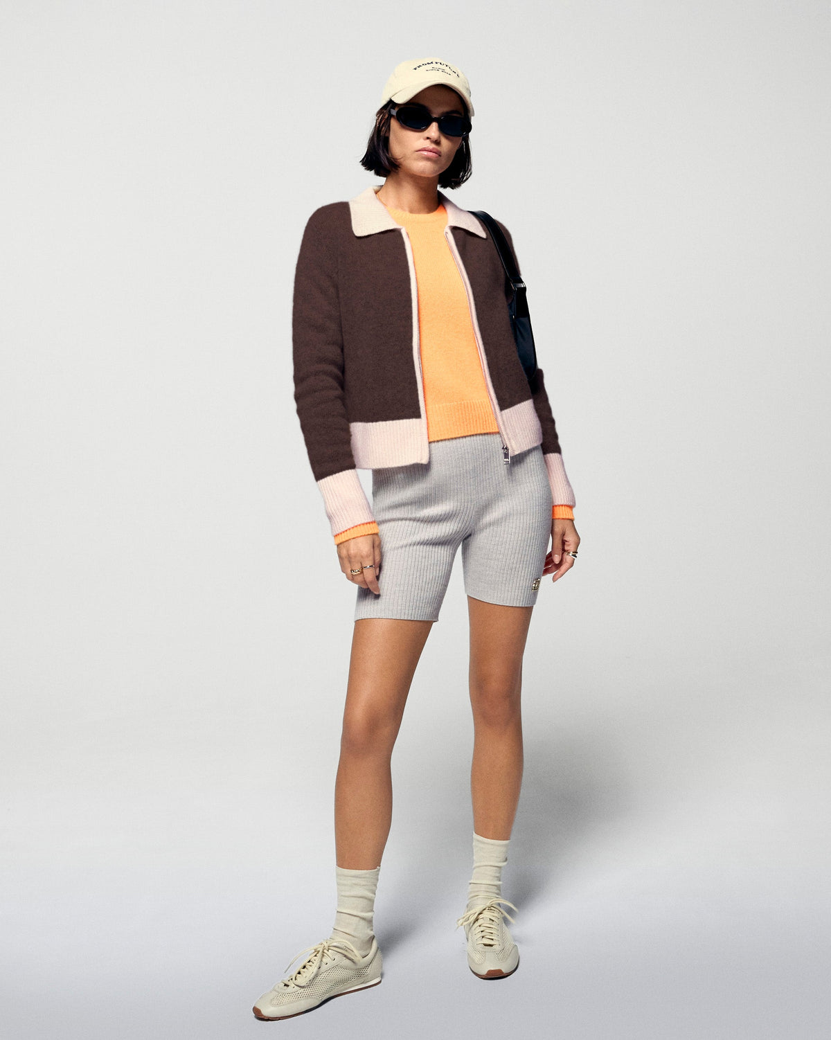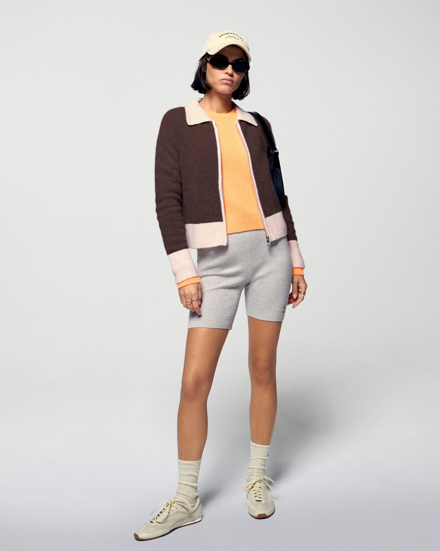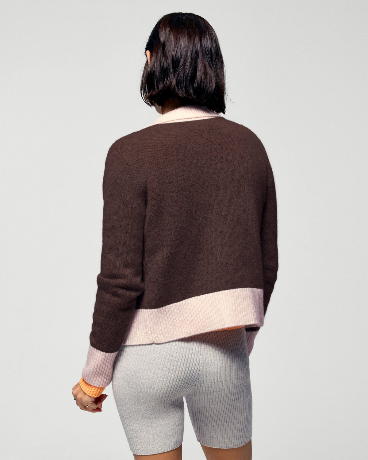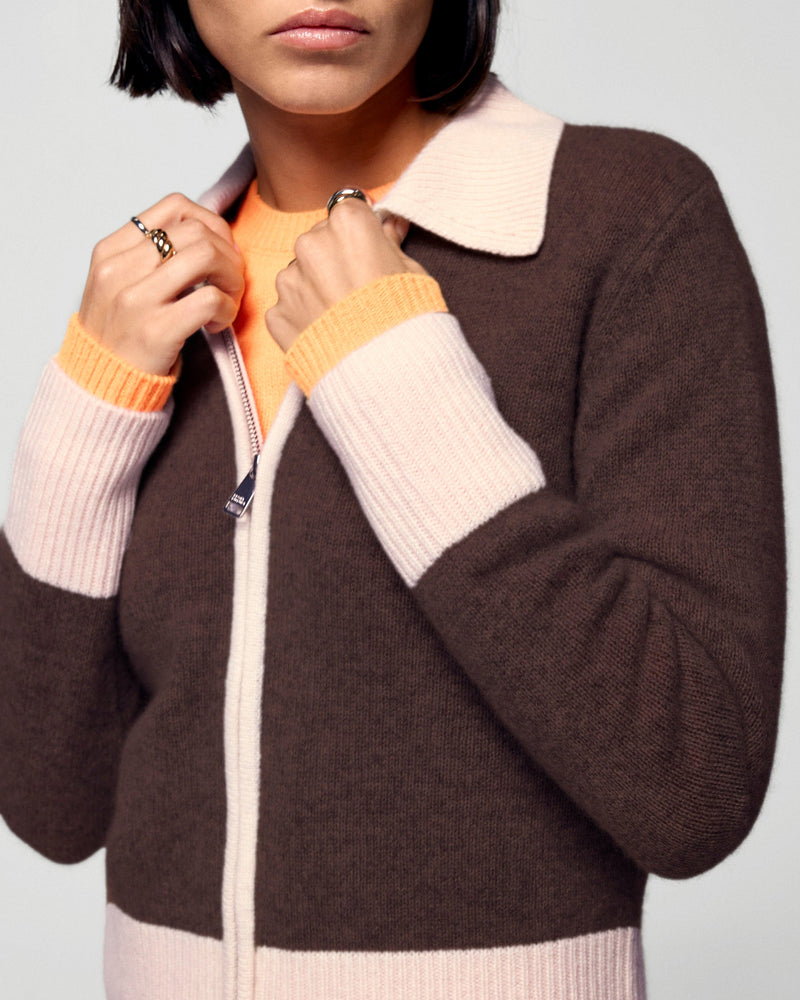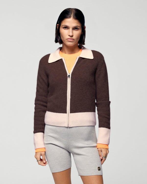 Dai un twist al tuo look stagionale con questo maglione-cardigan corto in cashmere! Un'audace miscela di stile, con bordi a contrasto che impreziosiscono il colletto, la chiusura a zip e i polsini. Indossalo con un paio di jeans casual o pantaloni strutturati per un look chic e casual!