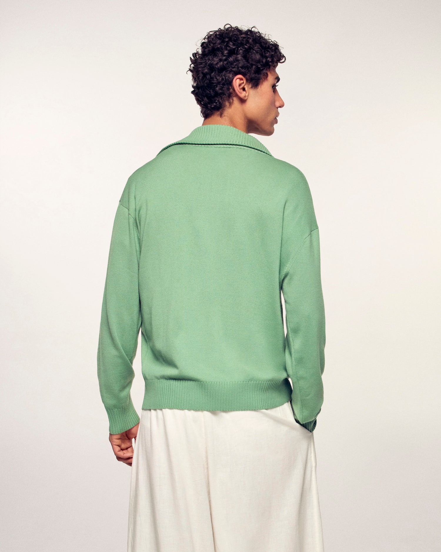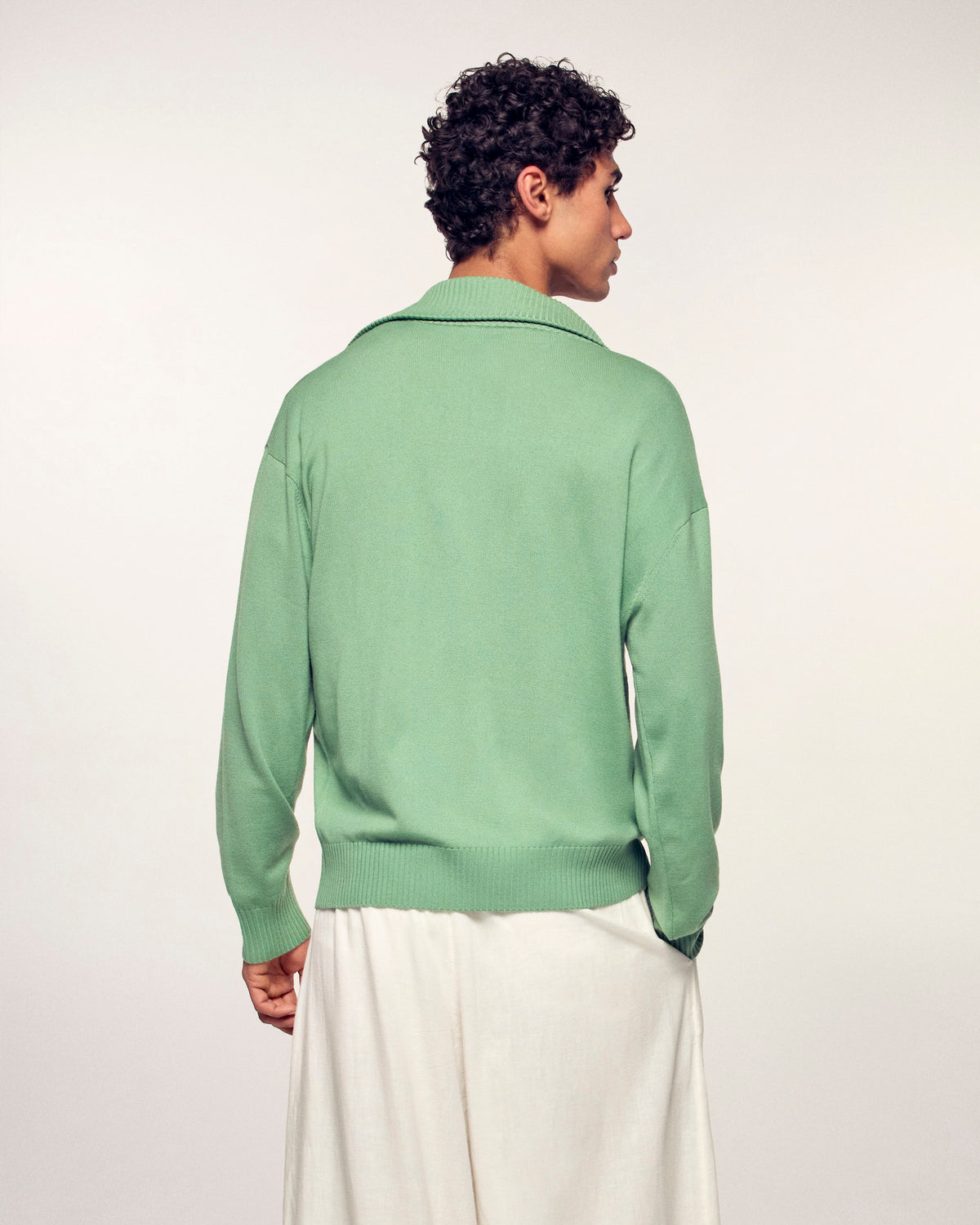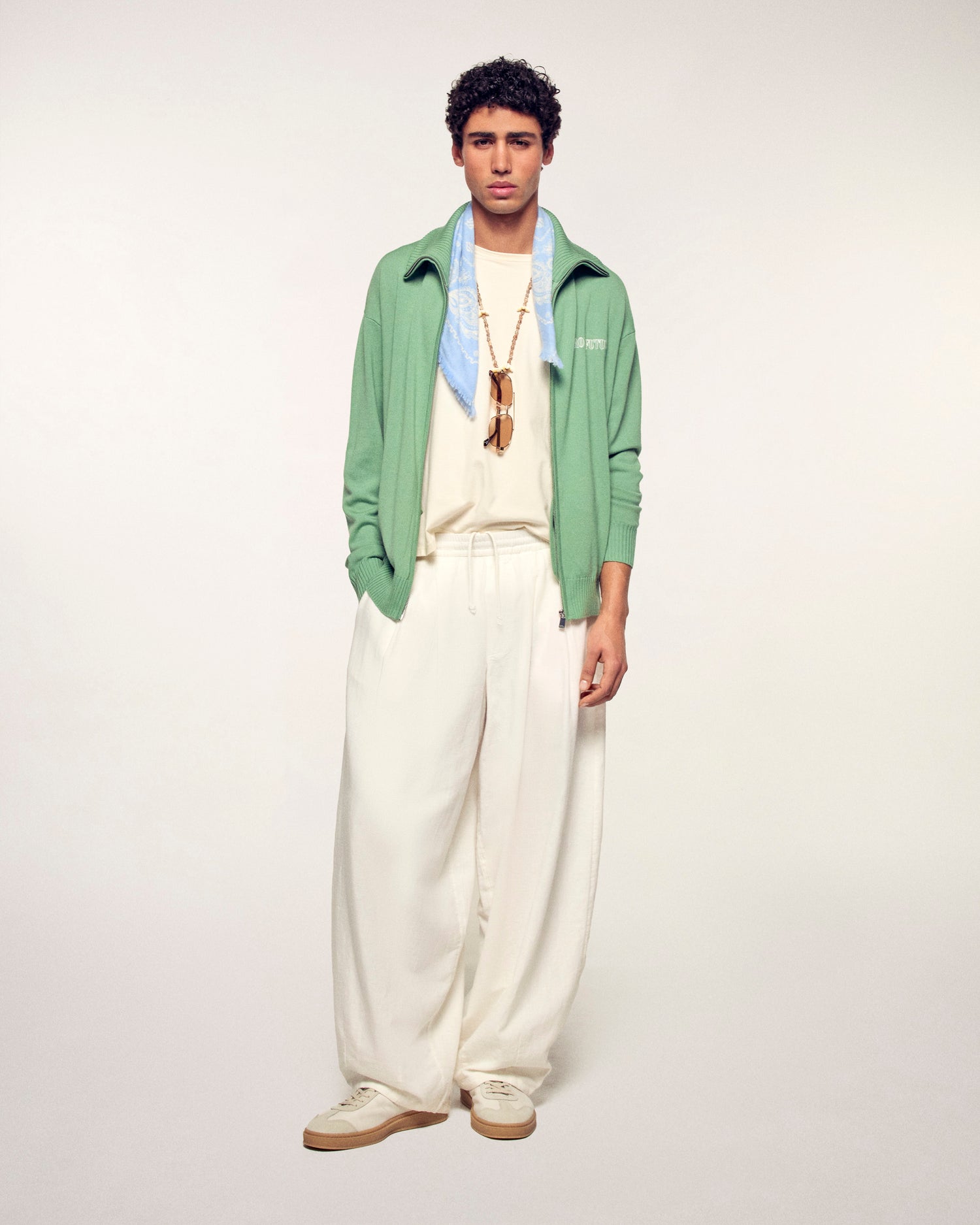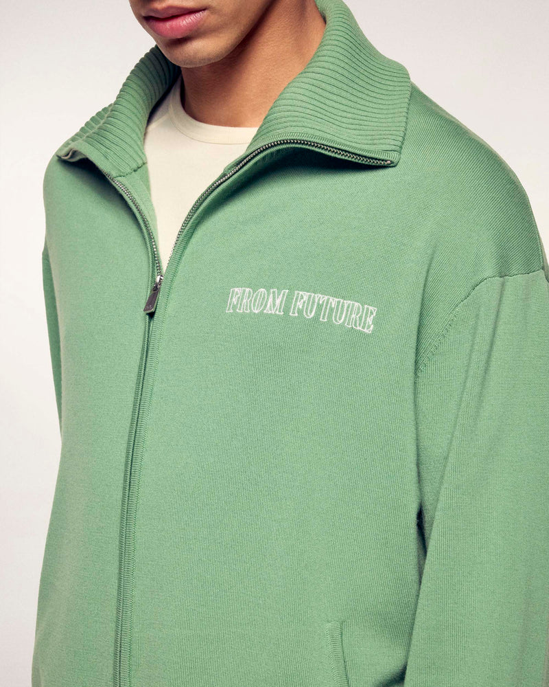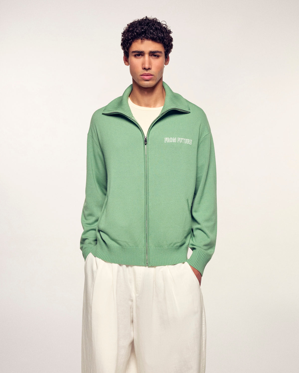 Un pezzo forte che unisce comfort termico e fascino urbano. Realizzato in 100% lana merino certificata RWS (Responsible Wool Standard) 4 fili, questo cardigan con zip offre una maglia spessa e protettiva. Il suo taglio oversize è impreziosito da un collo alto protettivo e da un ricamo "From Future" a contrasto sul petto.