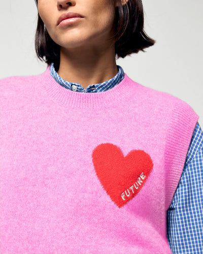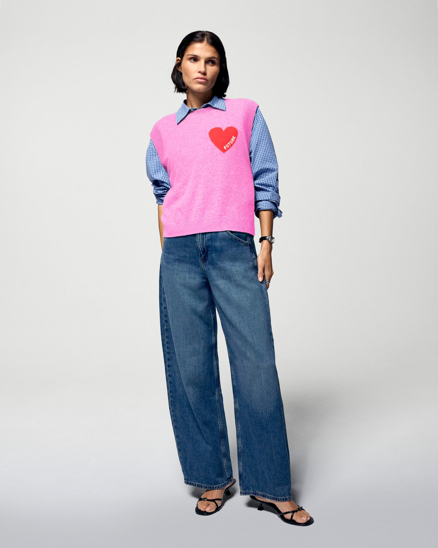 Unendo leggerezza e morbidezza, questo gilet corto e oversize in 100% cashmere è dotato di collo rotondo. Il dettaglio distintivo? Un cuore rosso ricamato con la scritta “FUTURE” appare sul petto. Indossalo da solo oppure sopra una camicia per un look sofisticato.