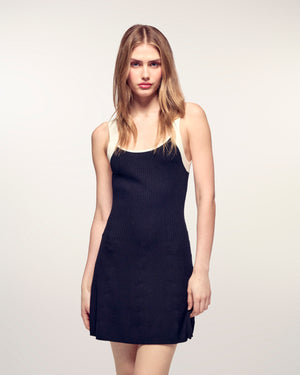 Una silhouette minimalista e a contrasto che coniuga comfort e modernità. Questo abito corto in lana merino si distingue per le spalline e il tubolare dello scollo a contrasto, offrendo un look grafico ed essenziale ideale per la stagione.