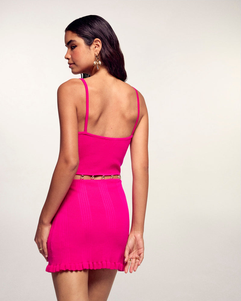 Radioso e singolare, questo abito corto in maglia diventa l'alleato delle tue serate estive. Realizzato in pura lana merino extrafine, si distingue per il gioco di ritagli in vita, sublimato da gioielli a conchiglia dorati e finiture a volant sul fondo del capo. Una silhouette estiva al contempo chic e audace, concepita in un materiale nobile che unisce comfort e raffinatezza.