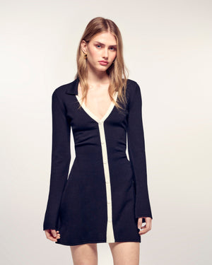 L'abito che unisce eleganza e stile sportswear. Realizzato in 100% Lana Merinos Extrafine, questo capo è strutturato da un taglio slim valorizzante e un colletto a camicia. Il dettaglio a contrasto dell'abbottonatura dona un tocco grafico e moderno.