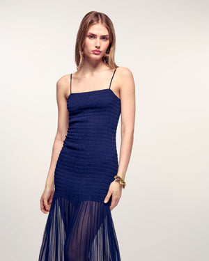 Abito lungo con spalline e corpetto a punto smock - Viscosio - Navy