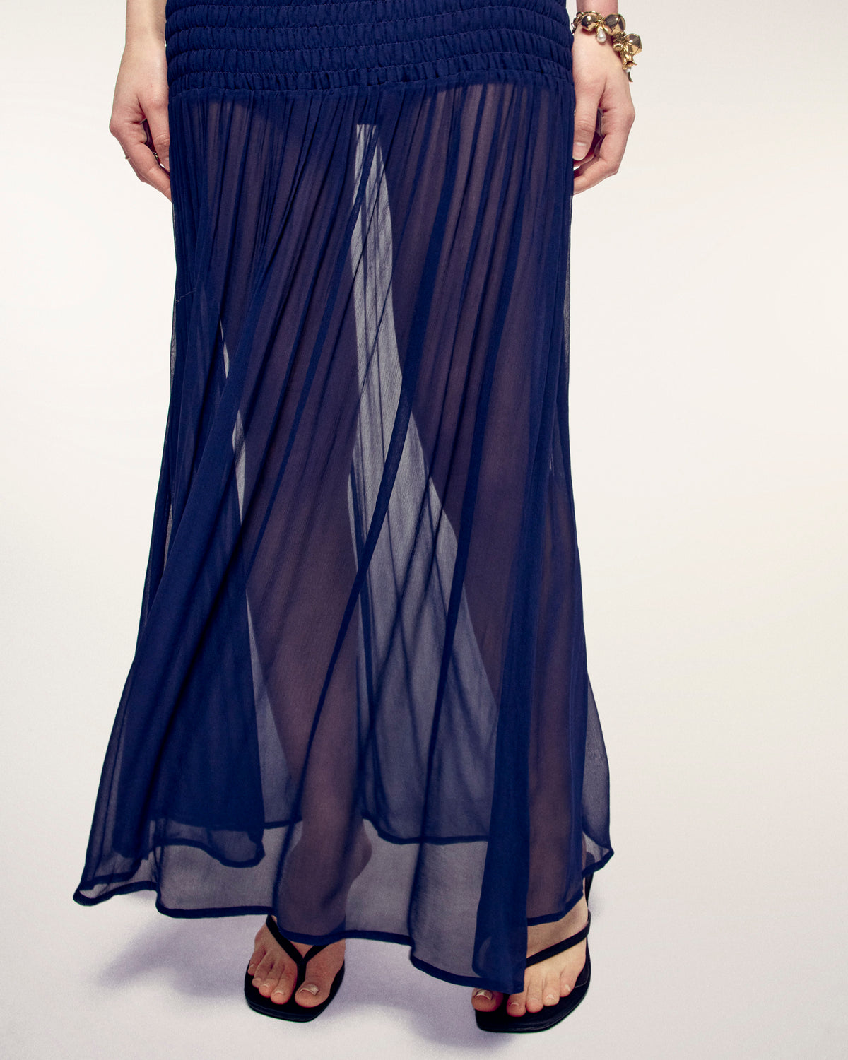 Una silhouette bohémien e raffinata per questo abito lungo che unisce comfort ed eleganza. Si distingue per il bustino interamente a punto smock che sottolinea delicatamente la vita prima di aprirsi in una gonna fluida, offrendo un'allure aerea ideale per le vostre giornate e serate estive.