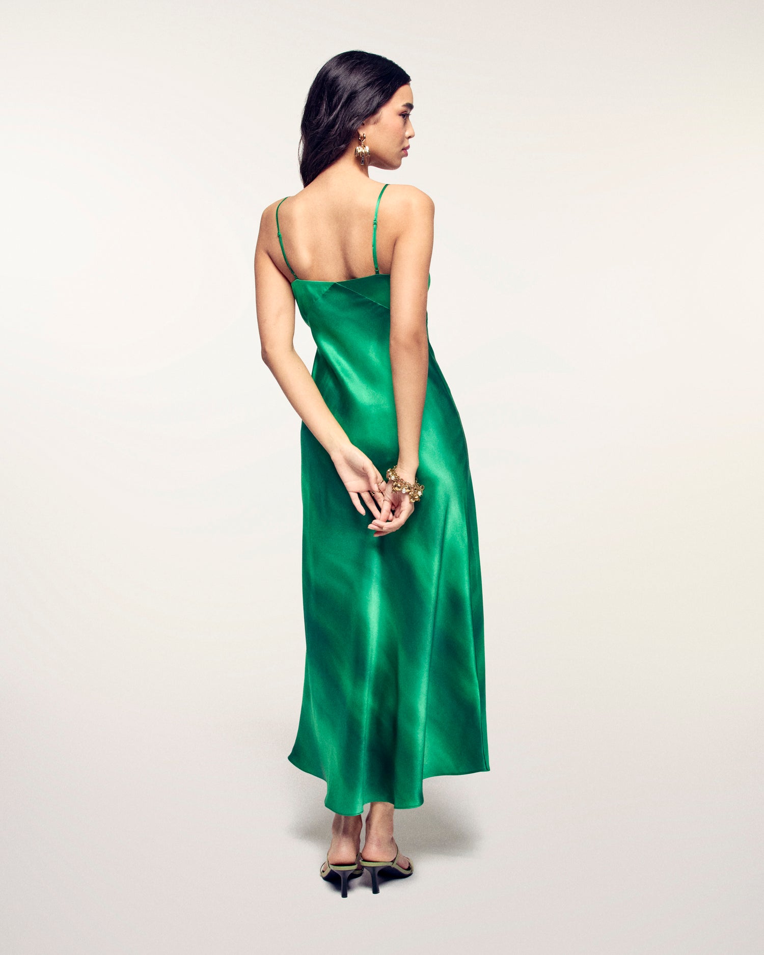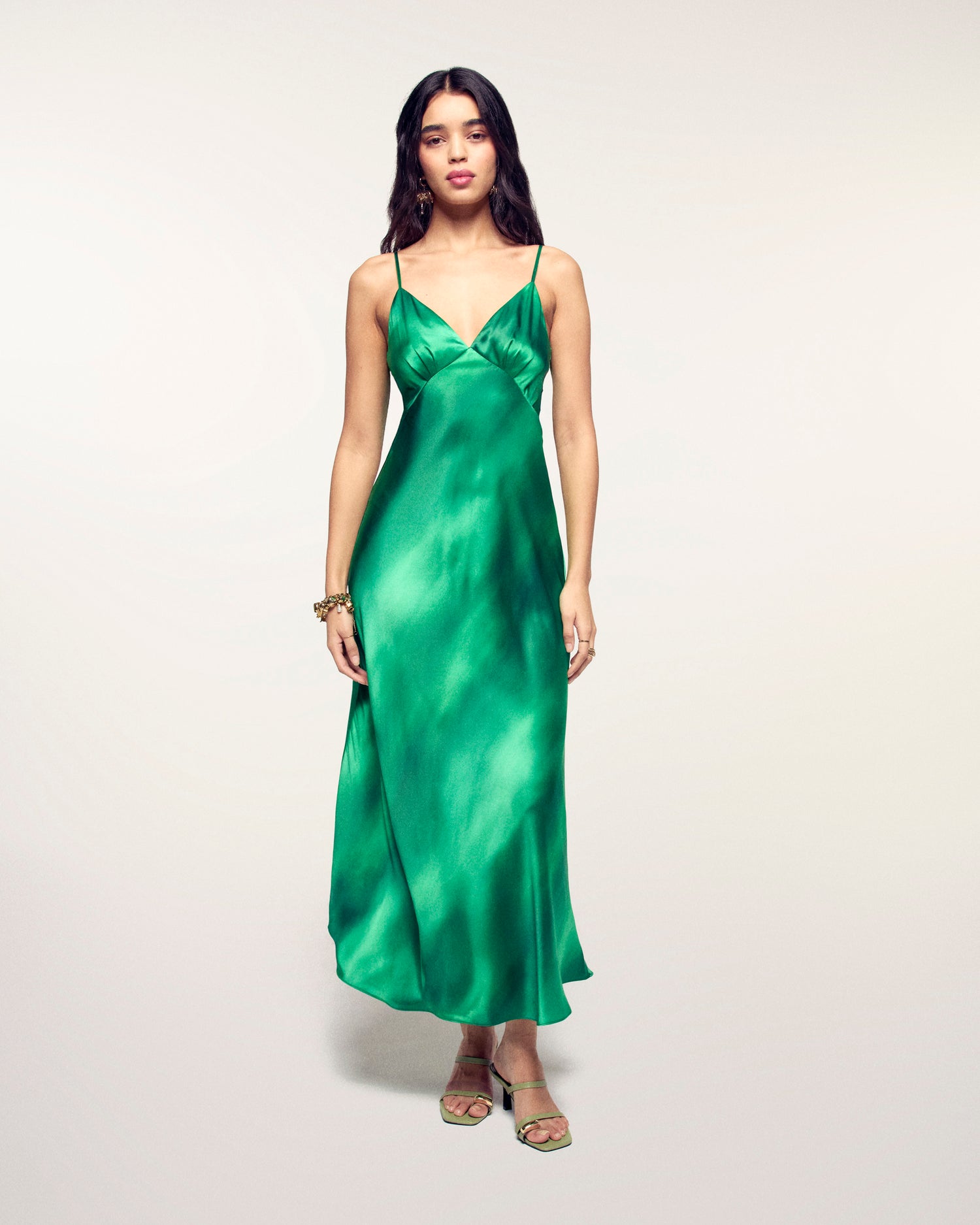 L'eleganza solare entra nel tuo guardaroba con questo abito lungo in raso di seta. La sua stampa sfumata e la vestibilità slim disegnano una silhouette affascinante, completata da uno scollo a V e sottili spalline regolabili. Un modello fluido e svasato, ideale per un look sofisticato e leggero.