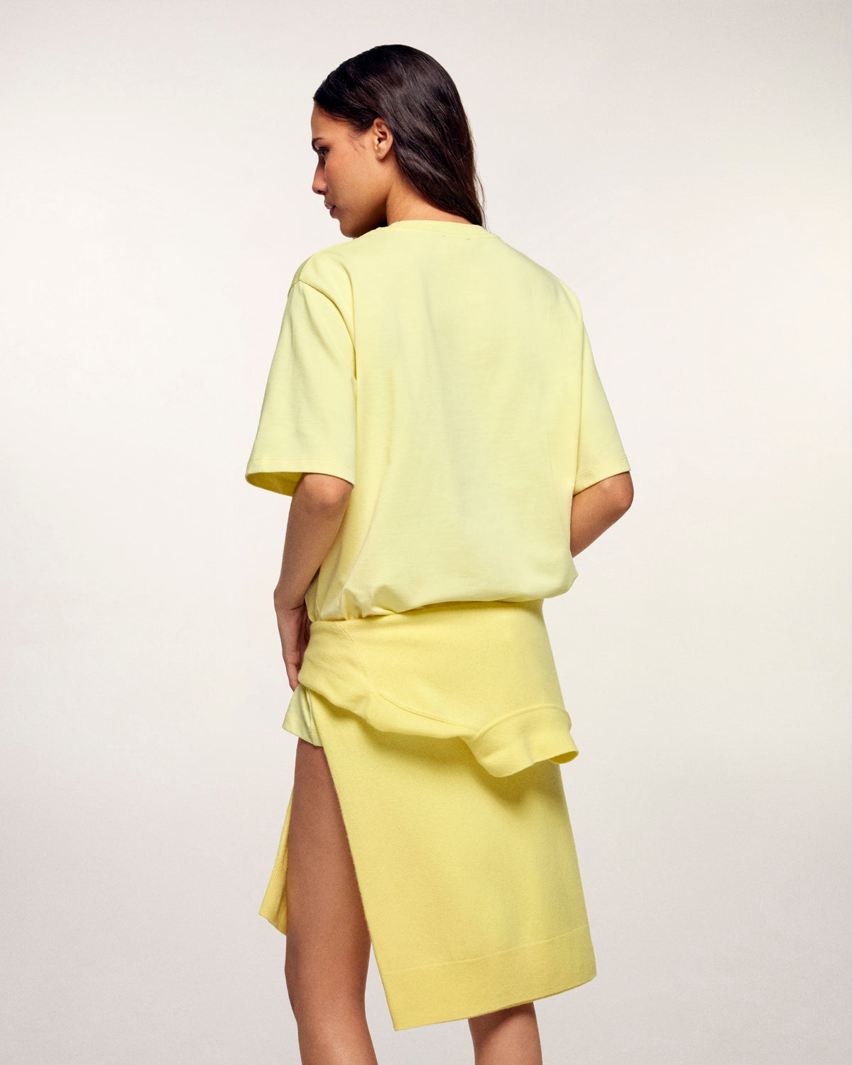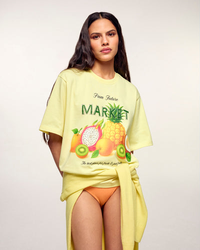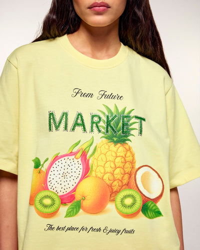 Un capo casual dal carattere solare e grafico che dona un'energia vitaminica al vostro guardaroba. Questa t-shirt in jersey di cotone si distingue per la sua stampa esclusiva "From Future Market", che illustra una composizione di frutta fresca per un'allure estiva e ludica.