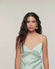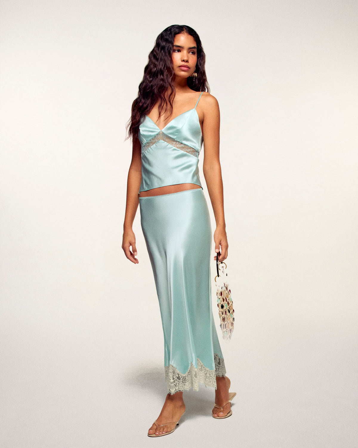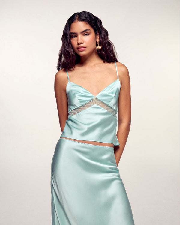 Gioco di trasparenze per questo top corto in raso di seta leggero e setoso. Dotato di spalline sottili regolabili, seduce con lo scollo a V e le bande in pizzo. Elegante e versatile, si abbina perfettamente a un pantalone sartoriale o a una gonna fluida.