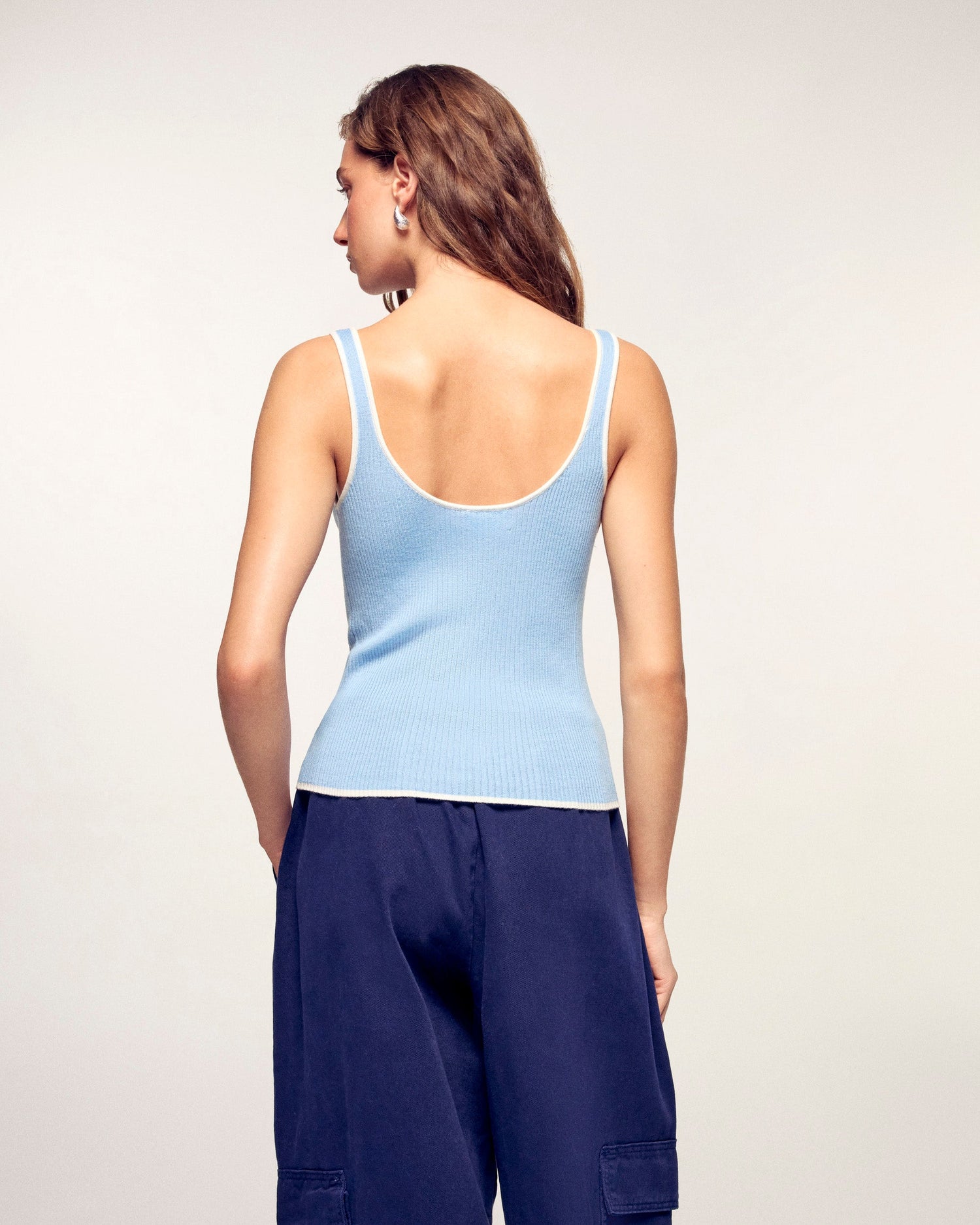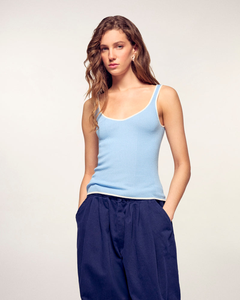 Un must-have del guardaroba estivo, questo top a canotta in lana merino extrafine punta su un elegante gioco di contrasti. La sua vestibilità aderente è valorizzata da finiture bicolore sullo scollo e sul giro manica, offrendo una silhouette moderna e grafica ideale per la mezza stagione.