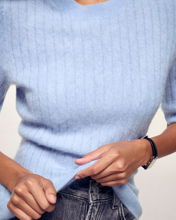 Top a Maniche Corte Brushed a Righe - 100% Cashmere - Verificato GCS - Baby Blue