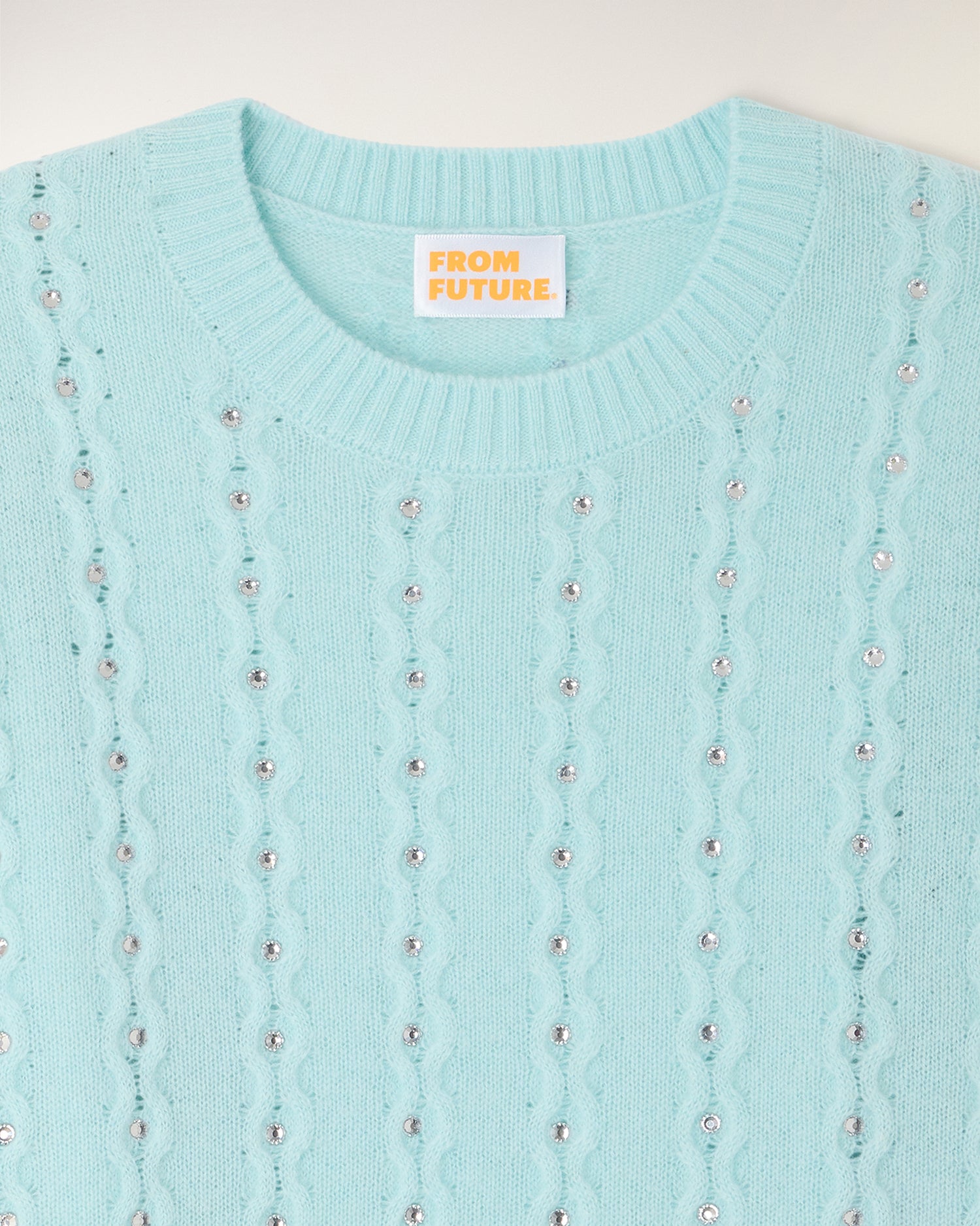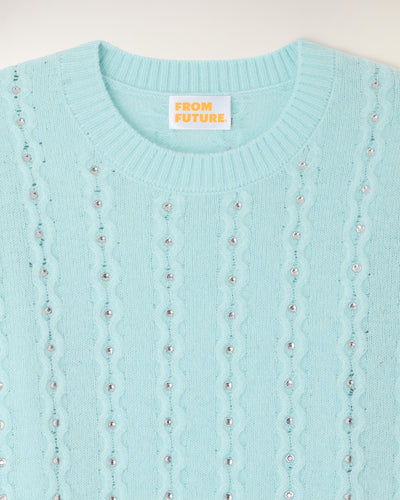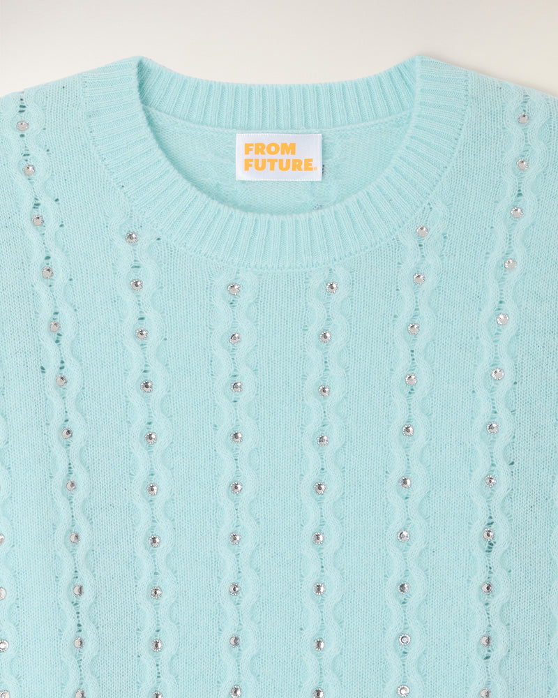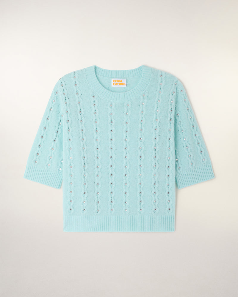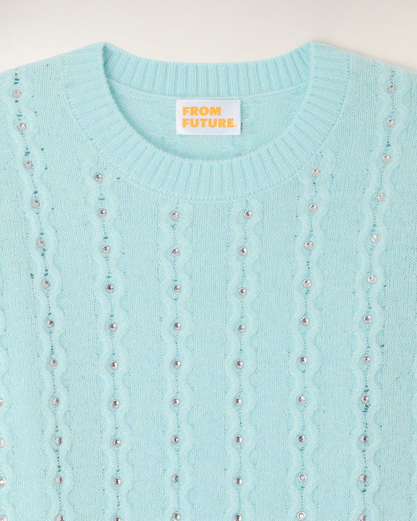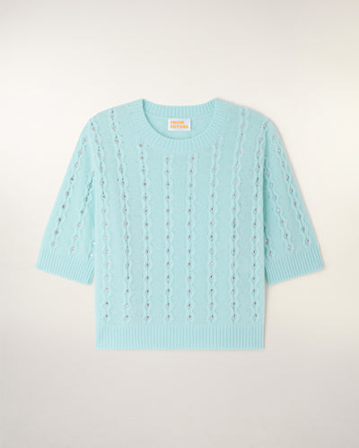 Une pièce précieuse et lumineuse qui revisite les classiques avec une touche d'éclat. Ce top en cachemire léger se distingue par son travail de torsades délicates sur l'ensemble du corps, sublimé par des strass intégrés pour une allure festive et sophistiquée.